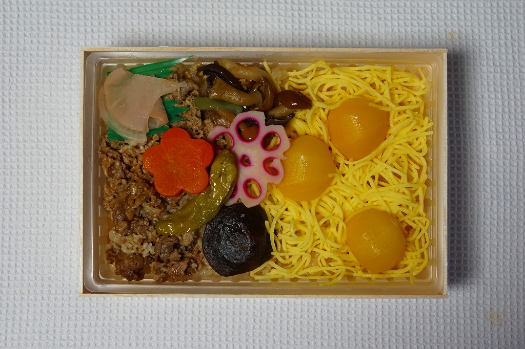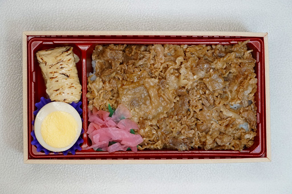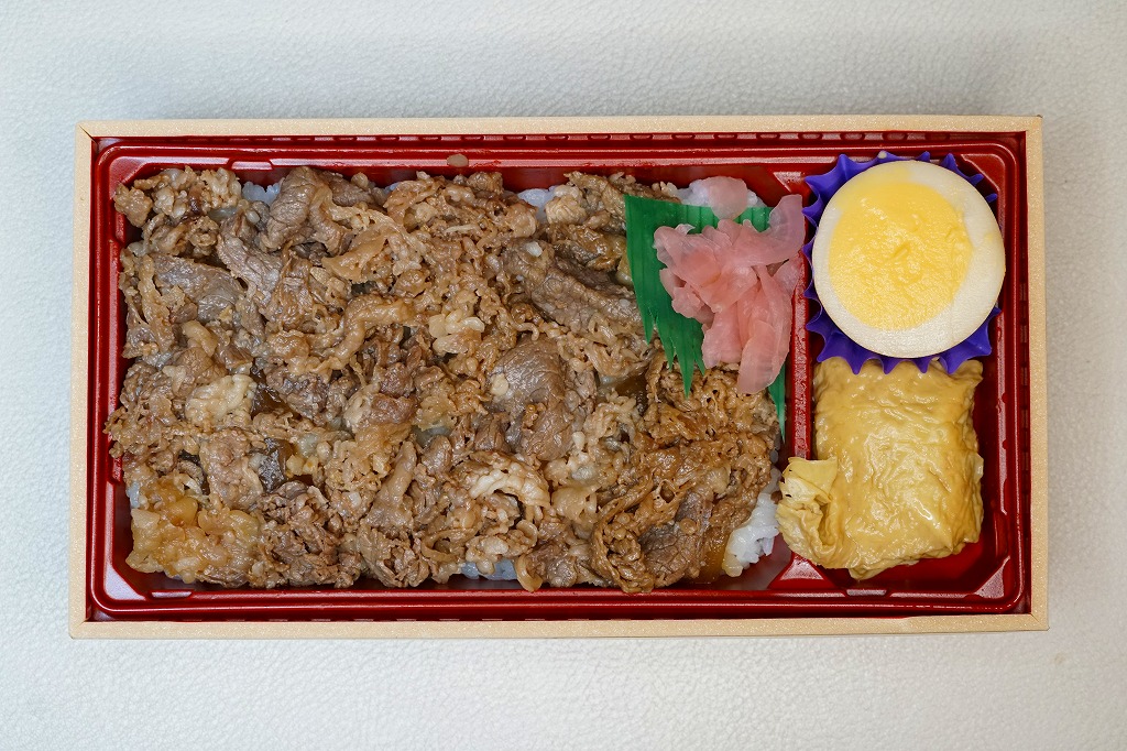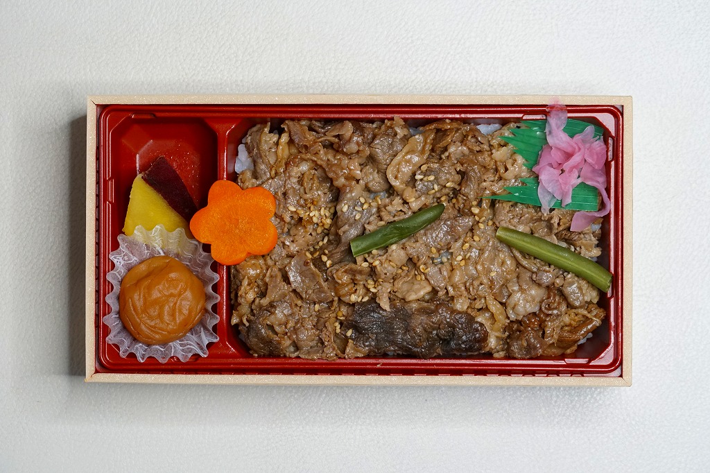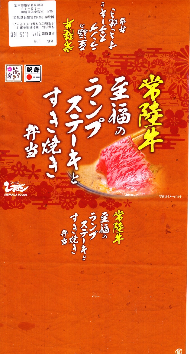 2024(令和6)年1月の京王百貨店の駅弁大会と2月の阪神百貨店の駅弁大会で、これと「常陸牛至福のランプステーキ弁当」と「至福のランプステーキローストビーフ贅沢盛り弁当」を実演販売。小柄な長方形の容器に白飯を詰め、常陸牛のランプステーキの切り身とすき焼き肉をきれいに並べ、ナムルと玉子とくりを添える。これはこれは前年に同じ場所で実演販売した弁当「常陸牛のロースステーキとすき焼き弁当」と、同じものではないだろうか。味は違い、ステーキは形が整い、すき焼きは柔らかくなり、シンプルでおいしい牛丼になって、200円の値下げ。これもはたして、水戸駅で売られることは、あるのだろうか。