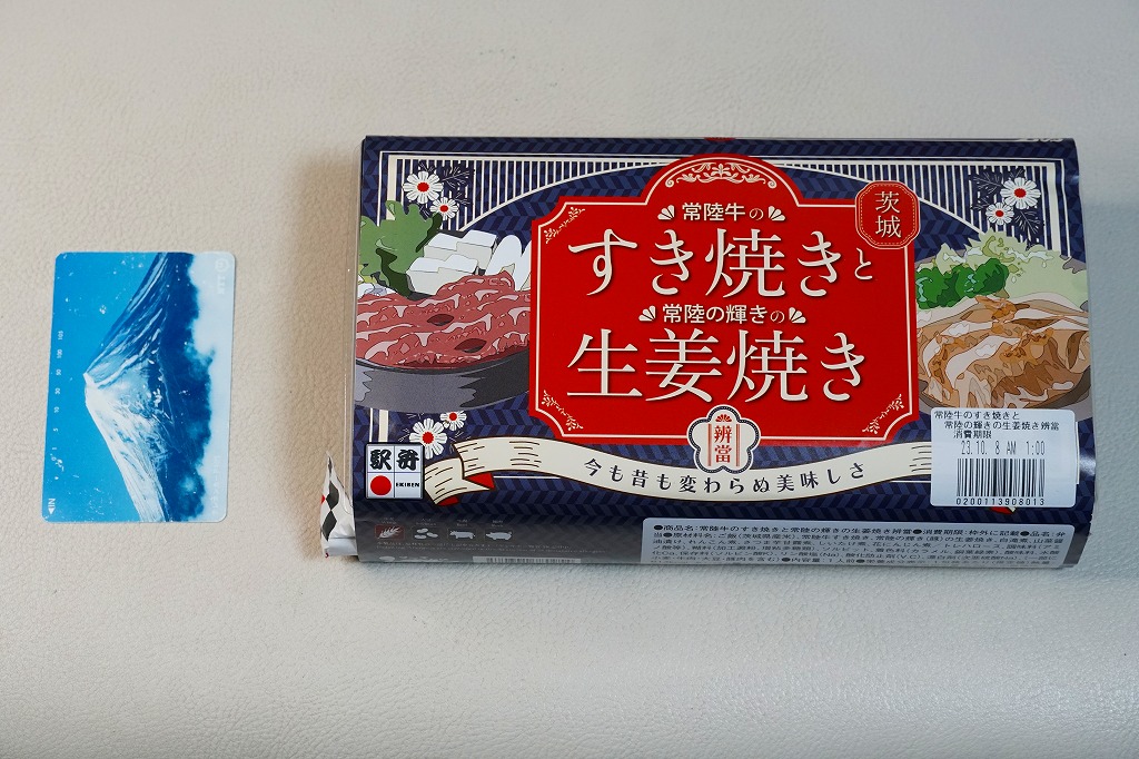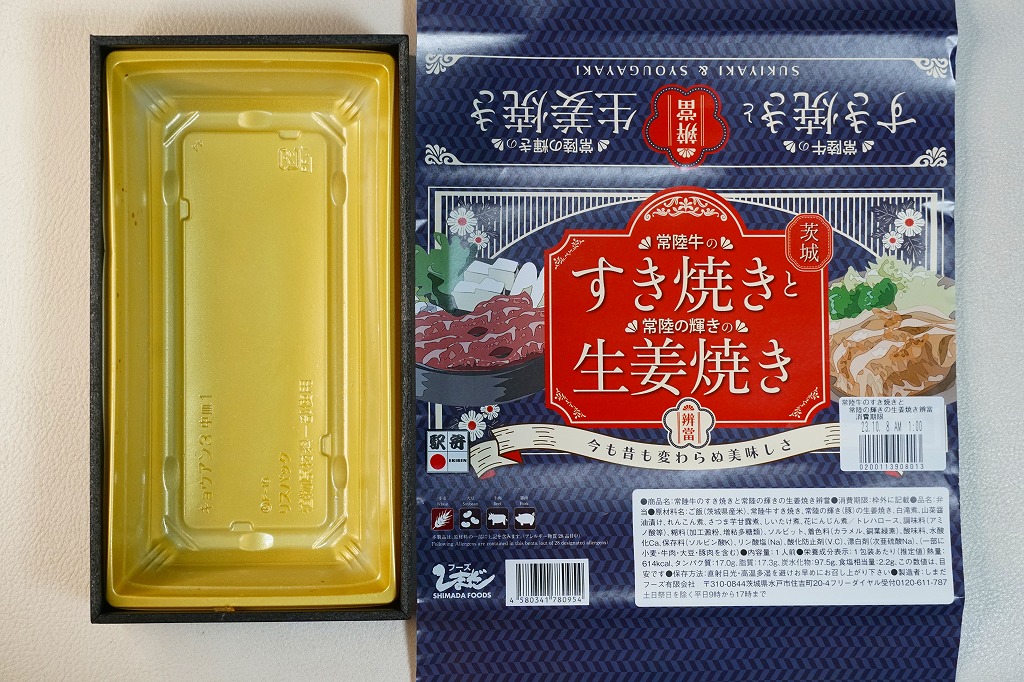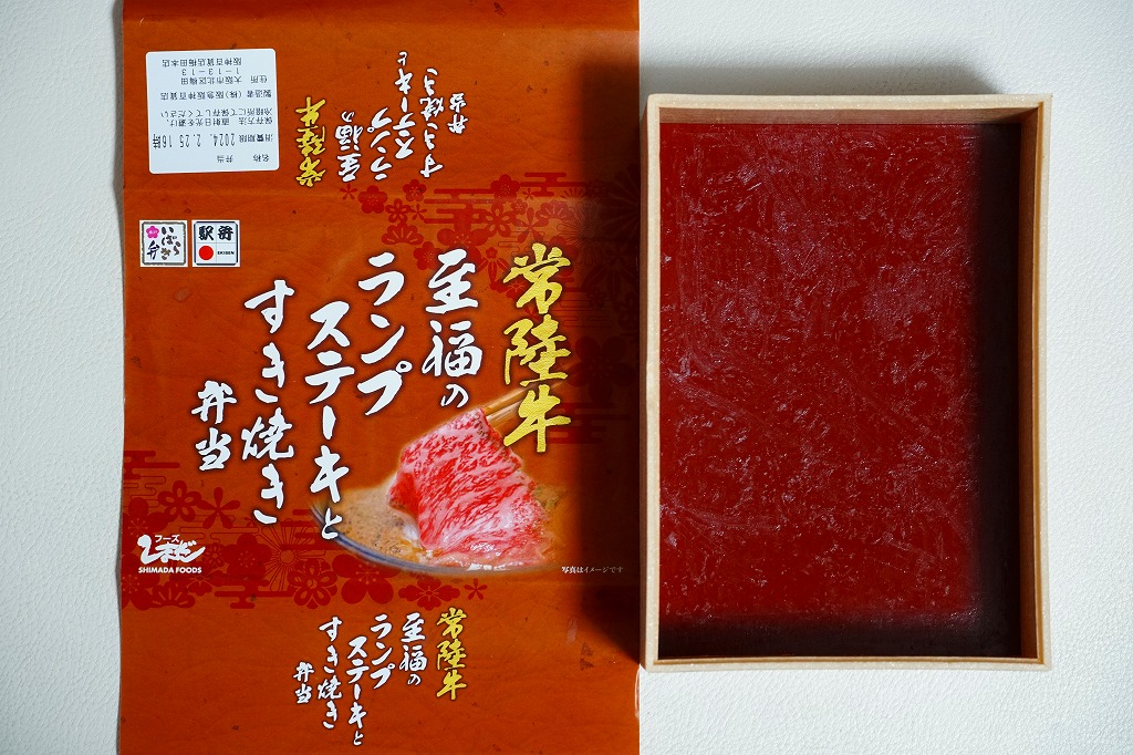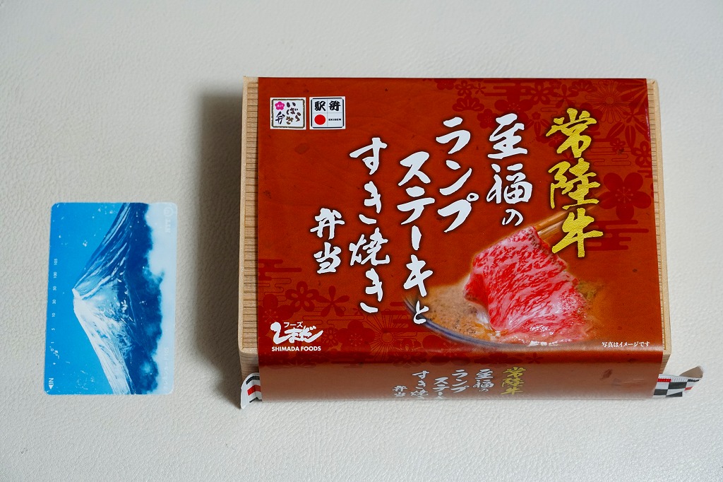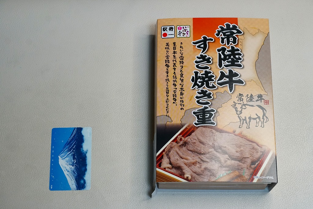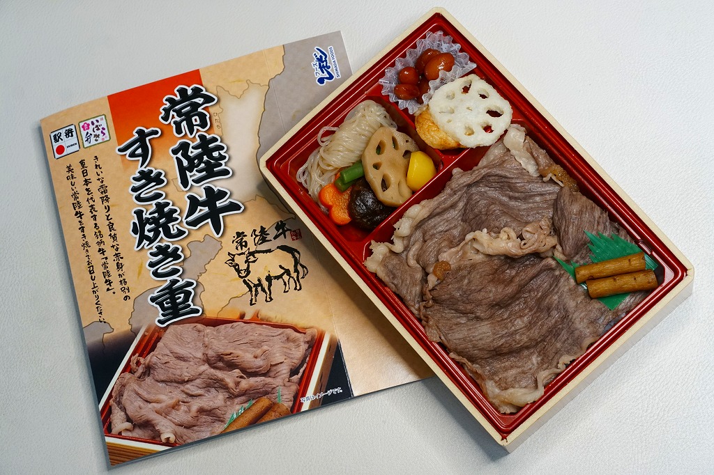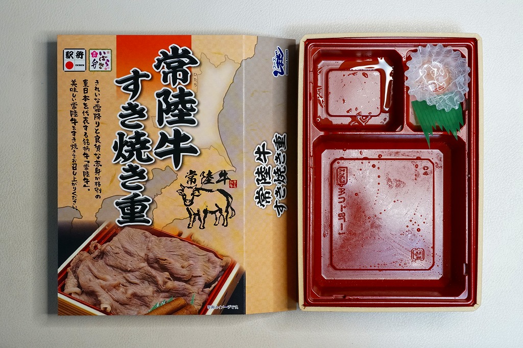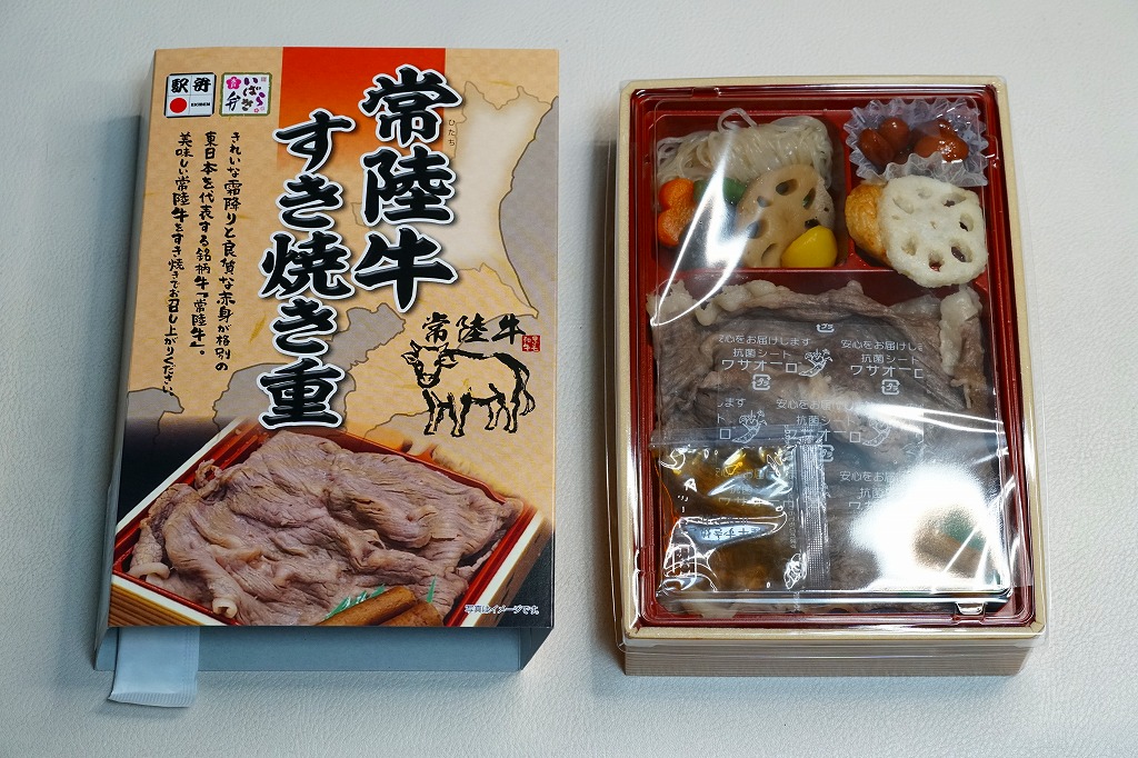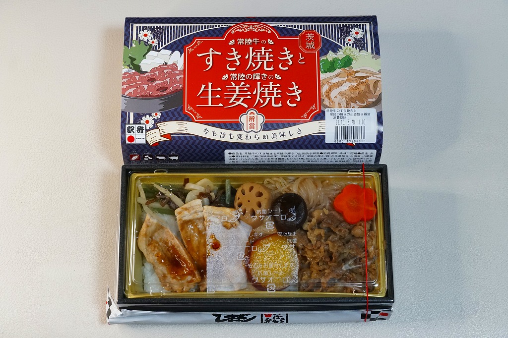 長方形のプラ容器に白飯を詰め、牛肉のすき焼きと豚肉の生姜焼きを載せ、山菜やさつまいもなどを添える。御飯は茨城県産米、牛肉は茨城県常陸牛振興協会が認定した黒毛和牛「常陸牛」、豚肉は茨城県畜産センターが開発し2018年から販売されるブランド豚「常陸の輝き」と、食材の大部分を茨城で固めたものの、いずれも一般的な食材であり、弁当にすると味の差もないので、掛紙の小さな文字を読まないと気付かないと思う。キャンペーンや現地での存在感はいかに。価格は2023年時点で1,380円、2025年時点で1,390円。