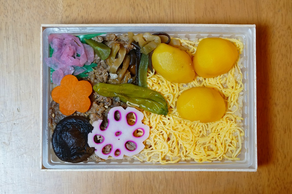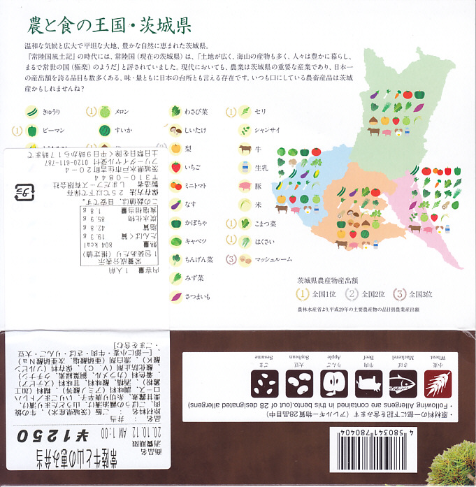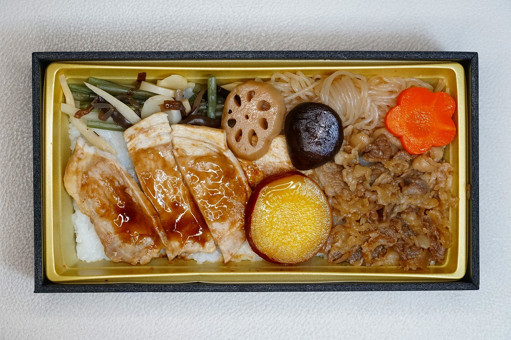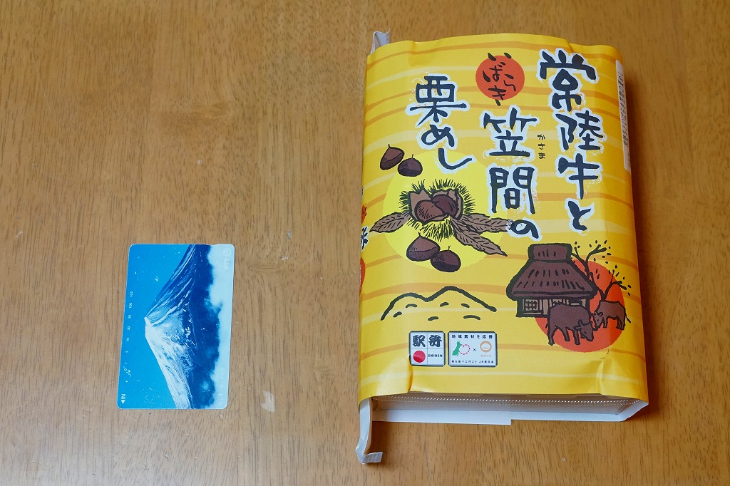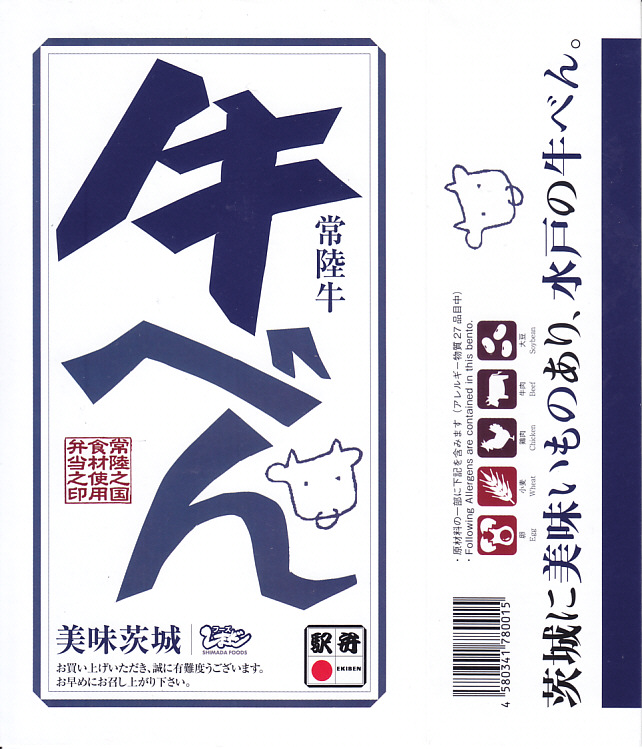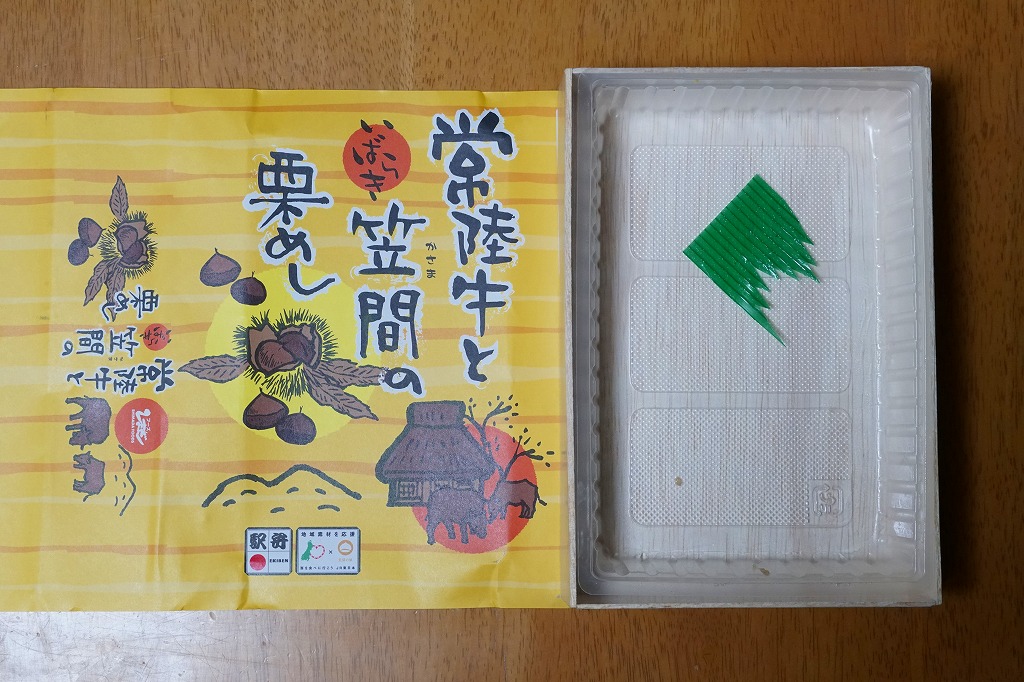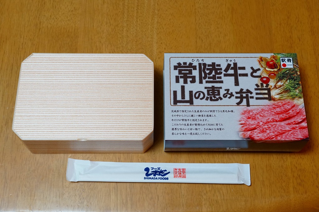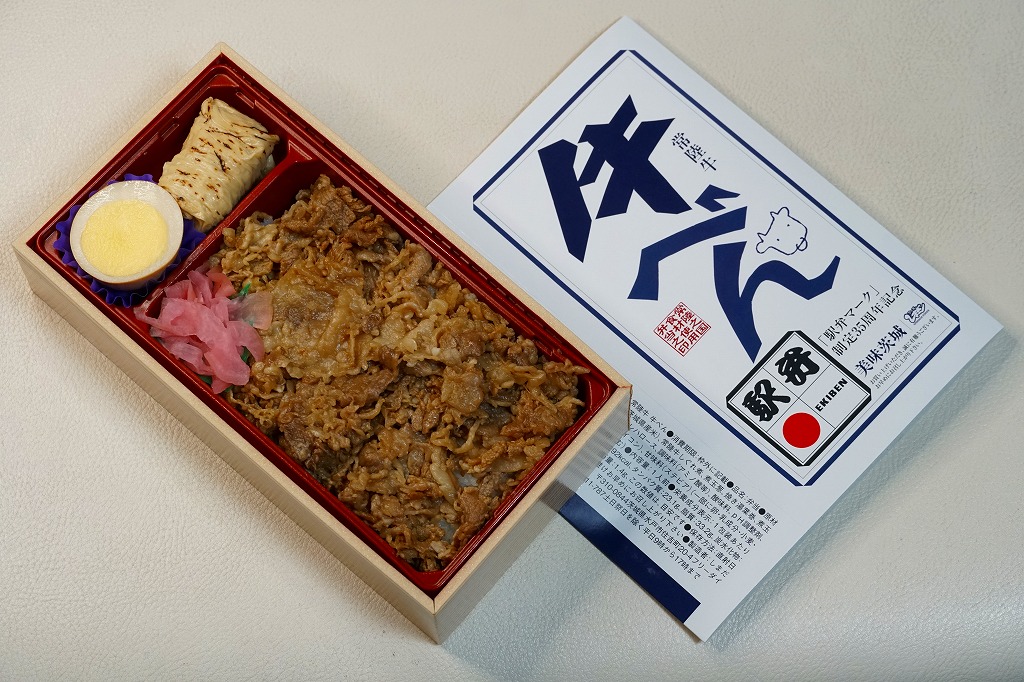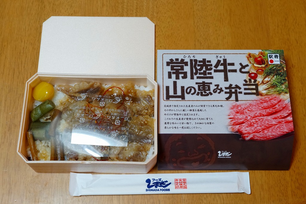 長方形のプラ容器に白飯を詰め、牛肉のすき焼きと豚肉の生姜焼きを載せ、山菜やさつまいもなどを添える。御飯は茨城県産米、牛肉は茨城県常陸牛振興協会が認定した黒毛和牛「常陸牛」、豚肉は茨城県畜産センターが開発し2018年から販売されるブランド豚「常陸の輝き」と、食材の大部分を茨城で固めたものの、いずれも一般的な食材であり、弁当にすると味の差もないので、掛紙の小さな文字を読まないと気付かないと思う。キャンペーンや現地での存在感はいかに。価格は2023年時点で1,380円、2025年時点で1,390円。