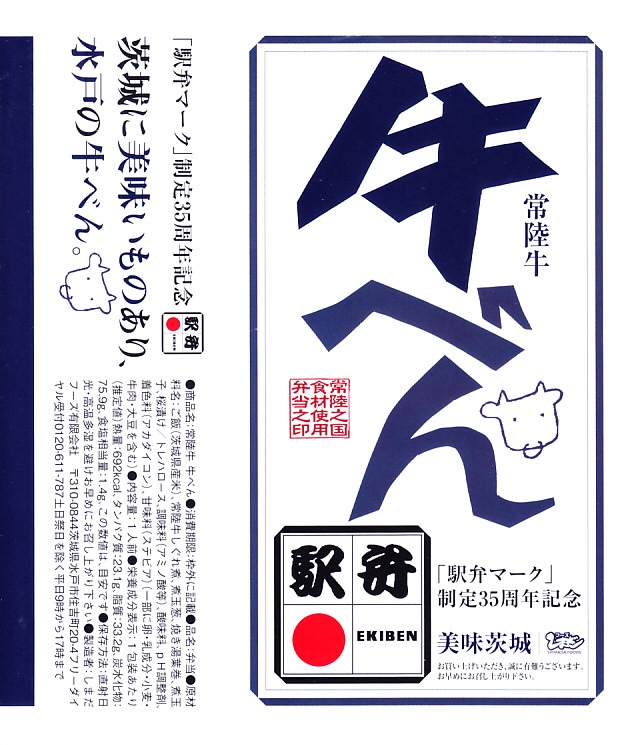 2023(令和5)年11月11日に購入した、水戸駅弁のスリーブ。日本鉄道構内営業中央会の「駅弁マーク」制定35周年を記念し、会員のうち29社が主に11月10日から期間限定で販売した31種類の記念駅弁のうち、水戸駅の駅弁屋のもの。既存の水戸駅弁で、2011年の新生水戸駅弁の一番手であった上記の「牛めし」のスリーブを、大きめの駅弁マークと「「駅弁マーク」制定35周年記念」の文字を入れたものに差し替えた。容器と中身と価格は変わらない。普段の水戸駅や勝田駅や東京駅などに加えて、新大阪駅や京都駅でも販売したそうな。