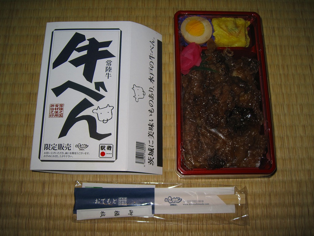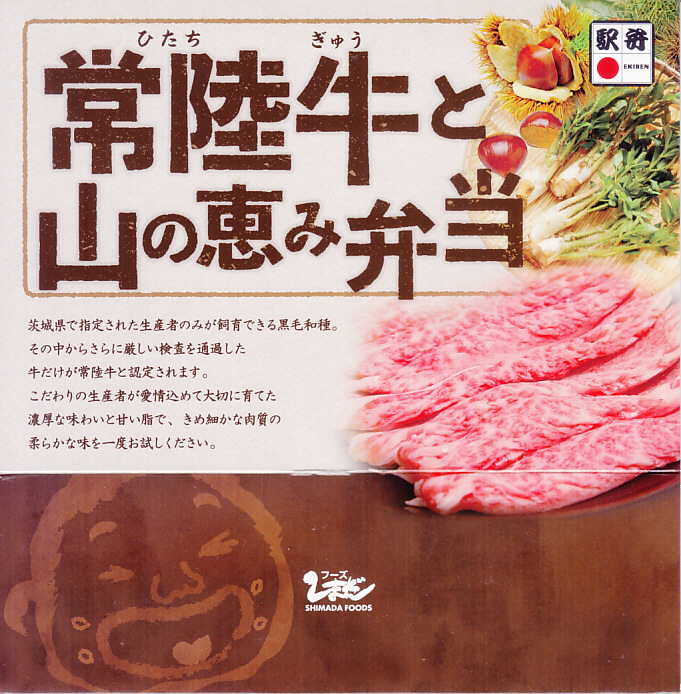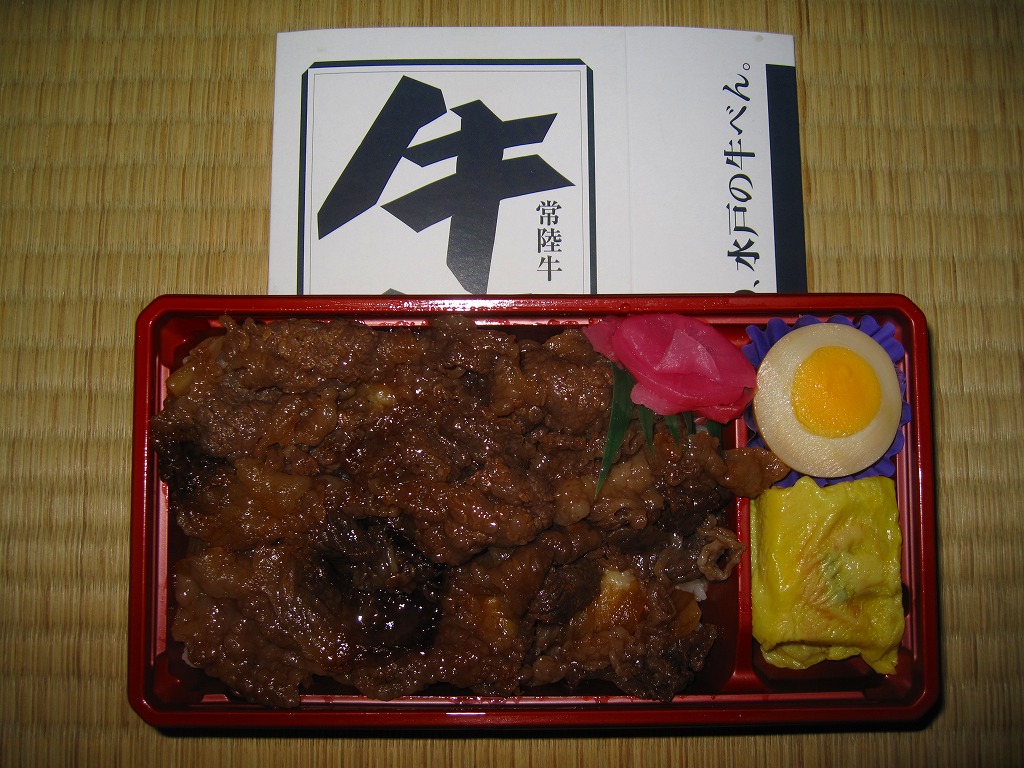 2011(平成23)年4月までに、水戸駅で発売か。白飯の上を常陸牛のしぐれ煮で覆い、高野豆腐のゆば巻きと煮玉子などを添える。内容こそ全国でありふれた牛肉駅弁であるものの、牛肉が飯の上で厚めに踊り、筋の固い赤身に分量豊かで溶ける脂身がぐにゃぐにゃにまとわりつき、B級グルメ感が強烈。価格は2011年の発売時で1,000円、2014年時点で1,050円、2020年時点で1,100円、2023年時点で1,250円、2024年9月20日から1,350円。