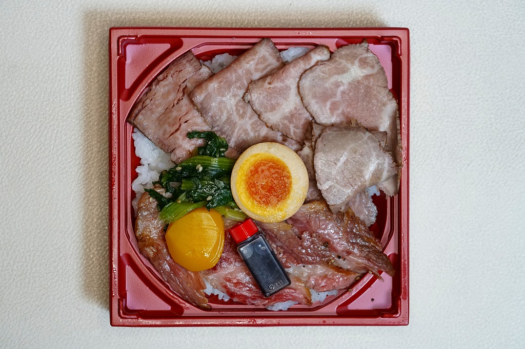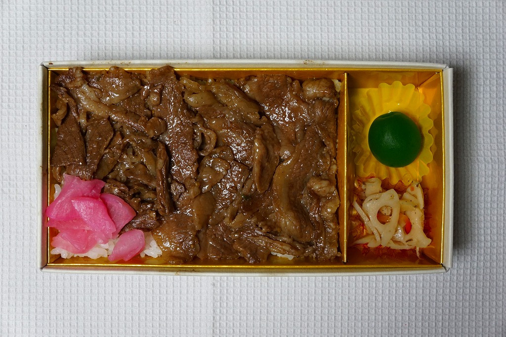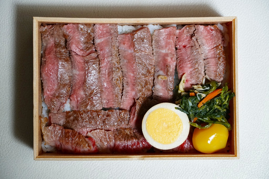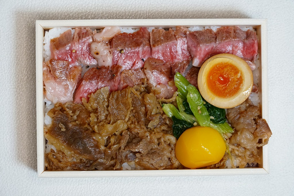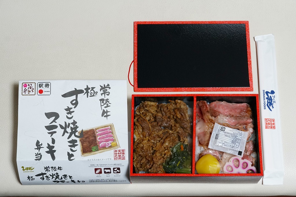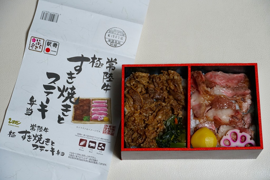 2022(令和4)年1月の京王百貨店の駅弁大会で実演販売。容器の半分が、白御飯を牛肉煮で覆うすき焼き丼、半分が白御飯を牛焼肉で覆うステーキ丼。茨城県のブランド牛である常陸牛(ひたちぎゅう)を使うといい、たしかに脂が豊かでおいしく、そのためにこれだけ高額な弁当となったのだろう。これが水戸駅で売られるかは分からないが、肉の質と味にこだわらなければ、上記や下記のとおり似た駅弁は買える。
