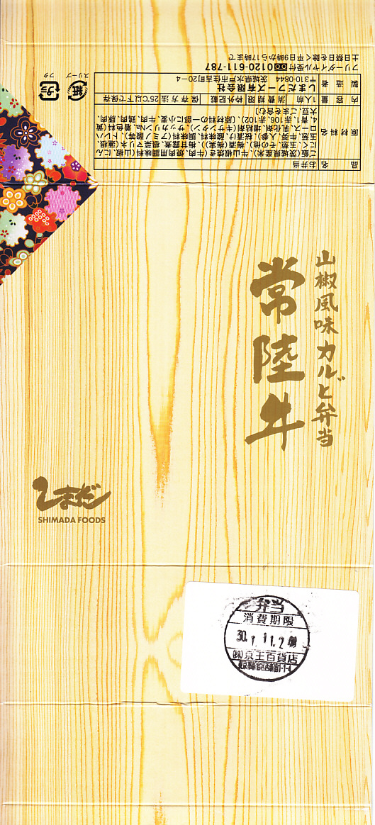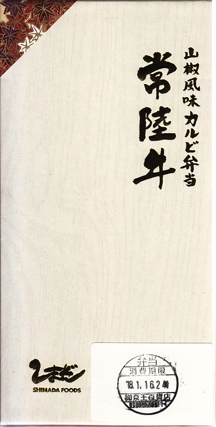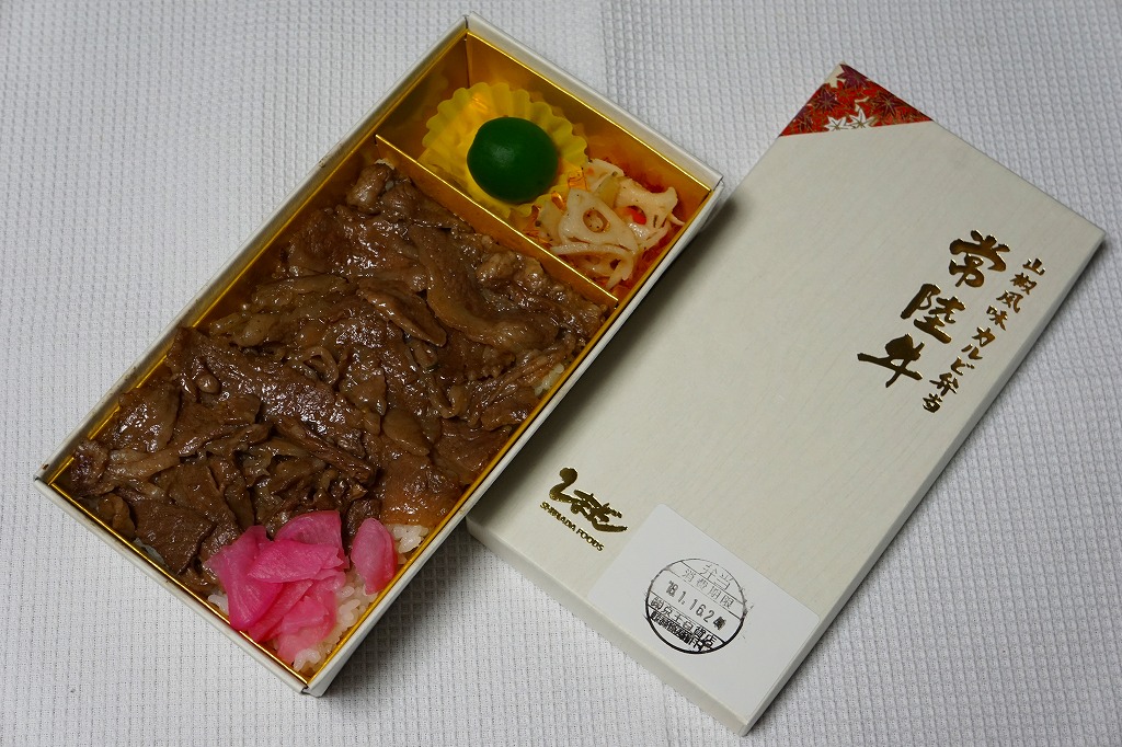 白木に金文字を押したような高級感のあるボール紙製容器を使う。これに茨城県産コシヒカリの白飯を敷き、常陸牛カルビ焼山椒風味で覆い、根菜のマリネと青梅の甘露煮を添える。水戸の酒造メーカー「名利酒類」の梅酒と山椒を使用した特製タレに漬け込んで焼き上げたという、牛の香りと肉の味付けがよく効いているが、常陸牛の特性なのかどうか、筋が勝り噛み切れない肉質には難儀した。水戸駅弁「牛べん」の上等版といった感じの、高級なB級牛丼駅弁。2019年に終売か。