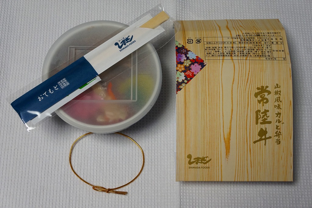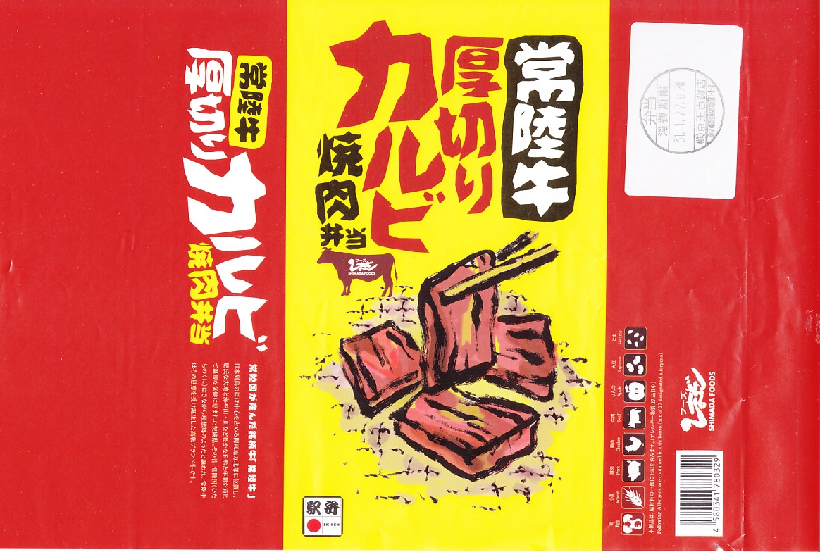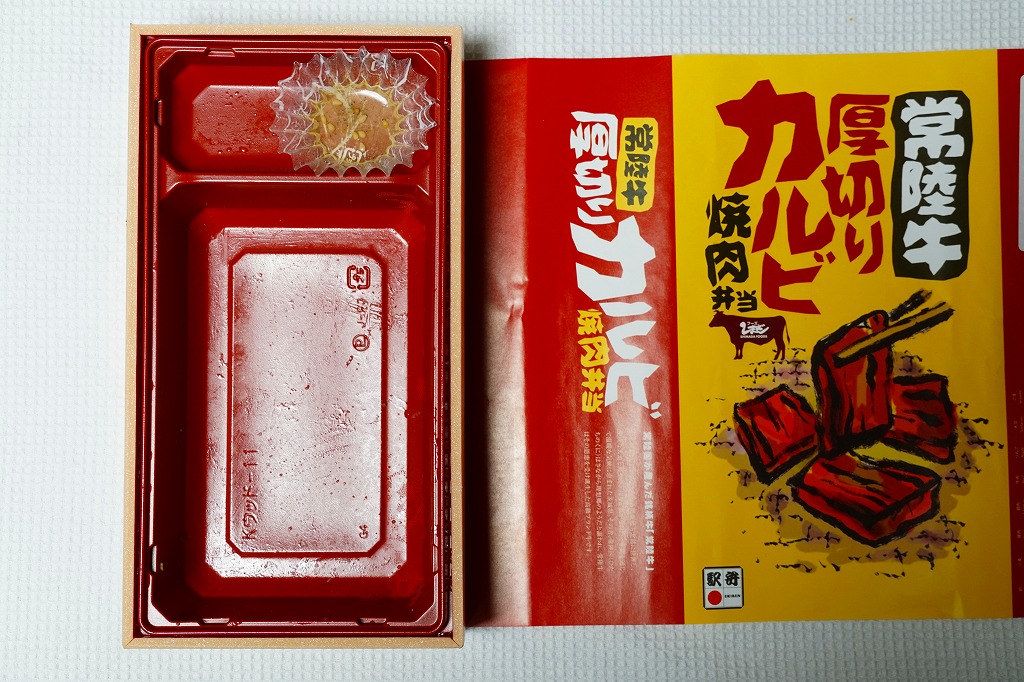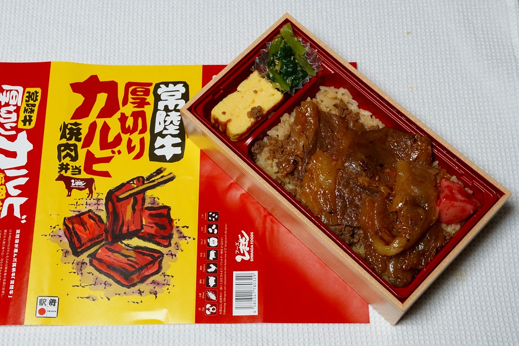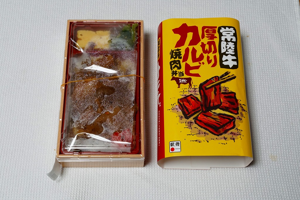 2019(平成31)年1月の京王百貨店の駅弁大会での実演販売でデビュー。牛そぼろ飯を駅弁の名前どおりの常陸牛厚切りカルビ焼肉で覆い、玉子焼、小松菜、梅れんこんを添える。メインの厚切り焼肉はにゅるにゅるで噛み切れず。さすが牛めしや豚めしで駅弁デビューした調製元だというB級グルメ感で、値段は高級駅弁なので、華美な商品が競う催事場では苦戦しているように見えた。その後に東京駅や水戸駅でこの姿のまま販売されたようで、その肉の風味はどうだろうか。価格は2019年の発売時や購入時で1,600円、2023年時点で1,680円、2025年時点で1,690円。
