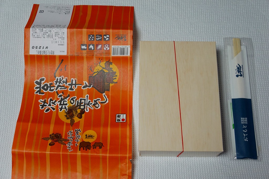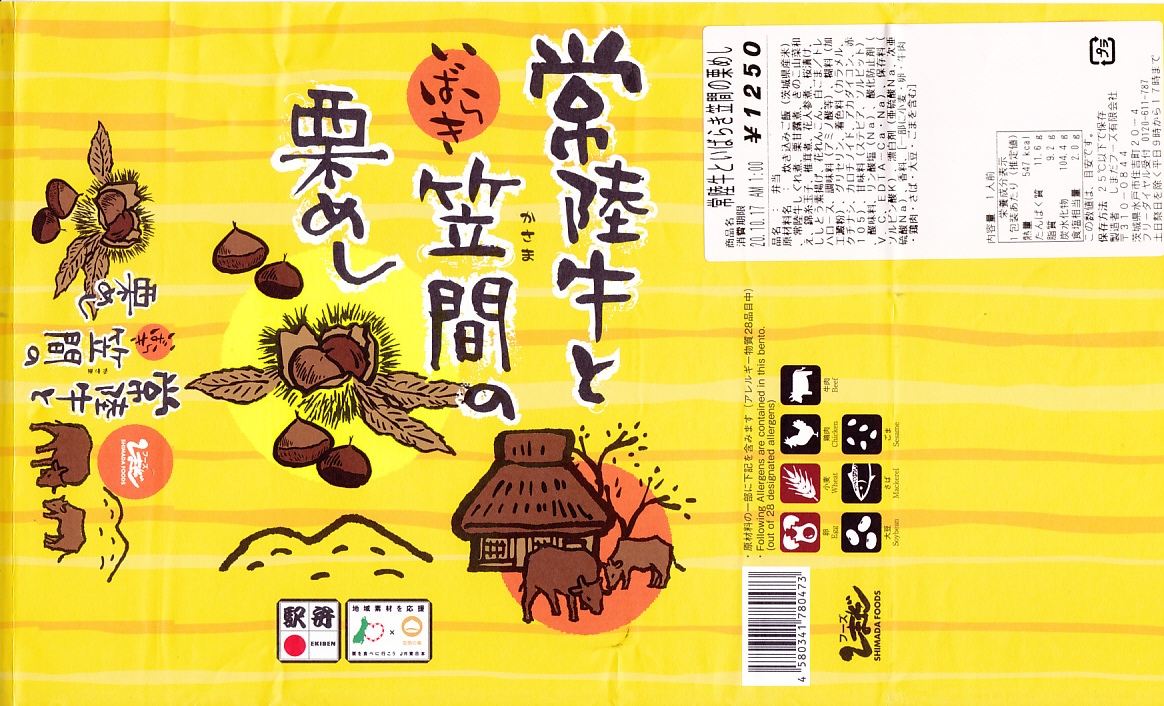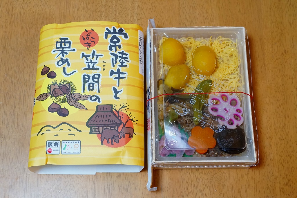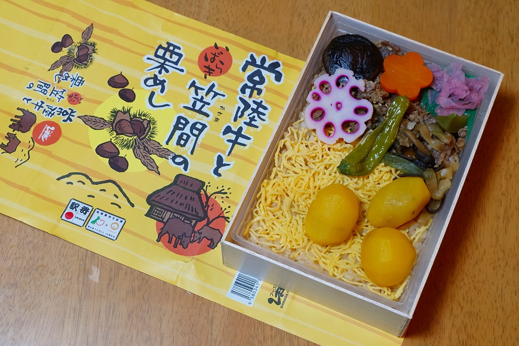 2020(令和2)年10月の新作で、同時にJR東日本の駅弁キャンペーン「駅弁味の陣2020」にエントリー。とはいえ、掛紙の絵柄を除き、容器も内容も風味も値段も、2年前の秋駅弁で、やはり駅弁味の陣にエントリーした「常陸牛と茨城の栗めし」と、まったく同じ。長方形の容器に炊込飯を詰め、半分を常陸牛のしぐれ煮で、半分を錦糸卵とクリ甘露煮で覆い、きのこ山菜、シイタケ、ニンジン、れんこん、ししとう、大根桜漬を添えた、牛飯と栗飯の組合せ。価格は2020年の発売時や購入時で1,250円、2023年時点で1,200円に改定。2023年までの販売か。
