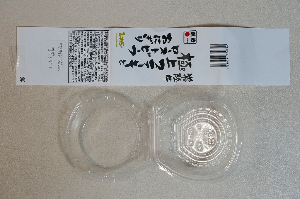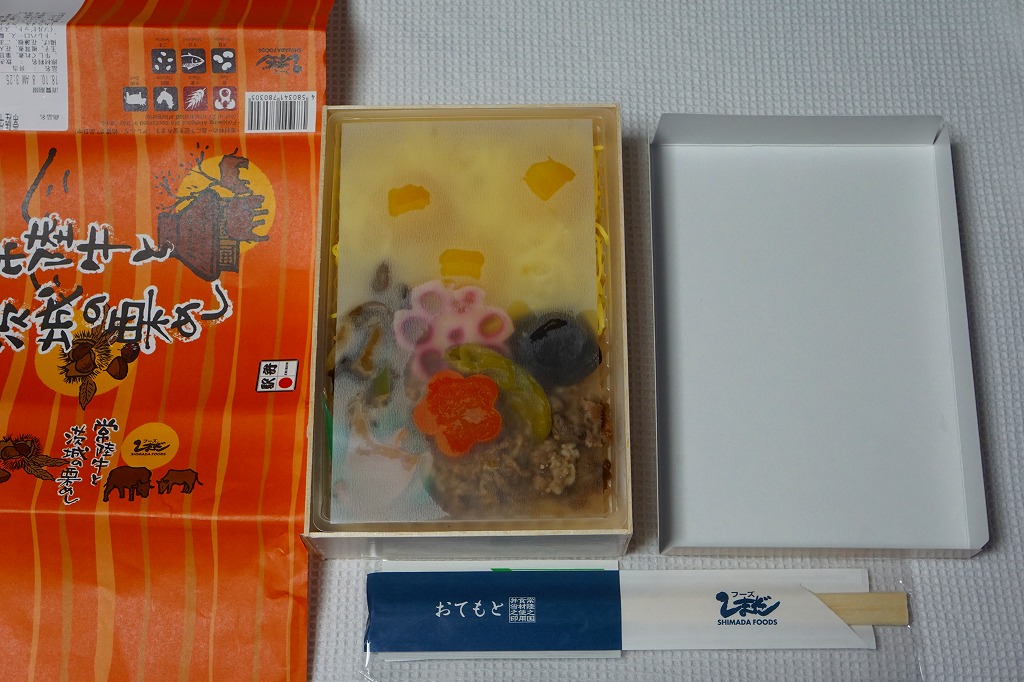 秋冬の駅弁大会シーズンに向けた、2021(令和3)年秋の新商品か。長方形の容器に白飯を詰め、平たい常陸牛のすき焼き肉で覆い尽くし、ごぼう漬、煮物、糸こんにゃく、揚げれんこん、金時豆などを添える。水戸駅には下記のとおり、お肉の駅弁は数あれど、そういえばすき焼き弁当がなかった。値は張るものの、催事でもおそらく現地でも冷蔵で売られるものの、見た目どおり、スリーブの見本写真どおりの風味は楽しめると思う。このシーズンのみの販売か。