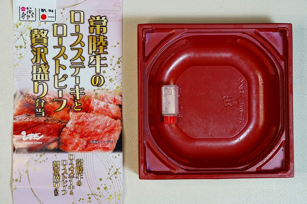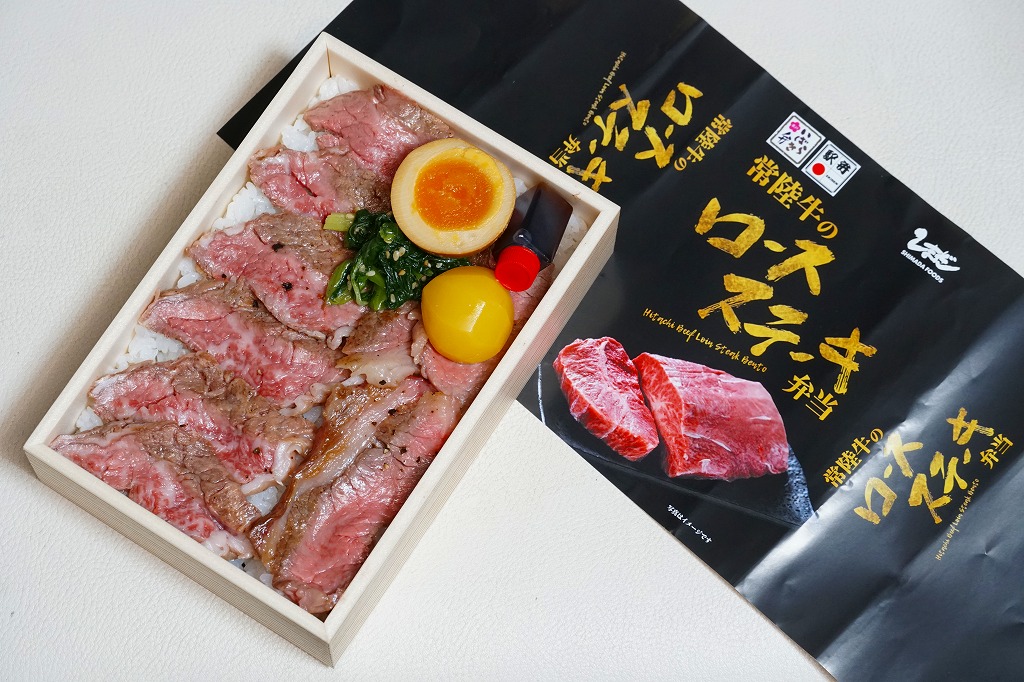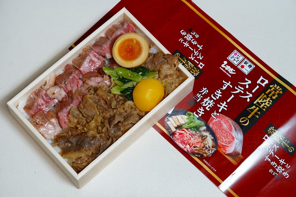2023(令和5)年1月の京王百貨店の駅弁大会で、これと 「常陸牛のロースステーキ弁当」と「常陸牛のロースステーキとすき焼き弁当」の3種を、水戸駅の駅弁として実演販売。これは正方形の容器に白飯を詰め、常陸牛のロースステーキとローストビーフで半分ずつ覆い、くりと青菜と煮玉子とタレと紅塩を添え、食材の写真が美しい白い掛紙を巻いた。まだ赤くて噛み切れない牛ステーキと、サクサクしたローストビーフが印象的で、こんな駅弁は見たことがない。駅弁を売る水戸駅のコンビニで見ることが、できたかどうか。