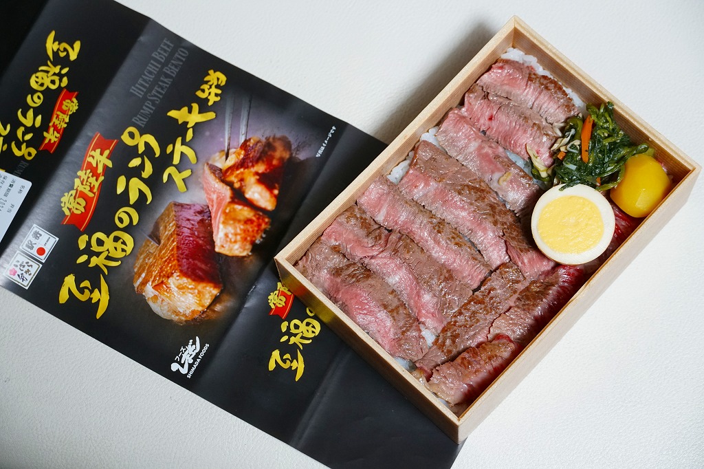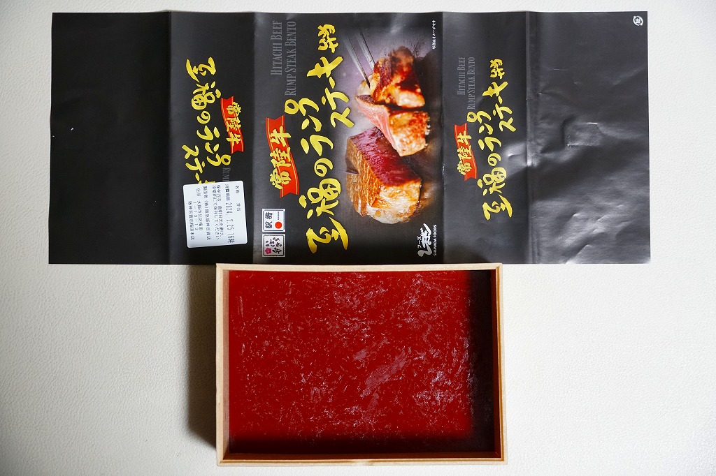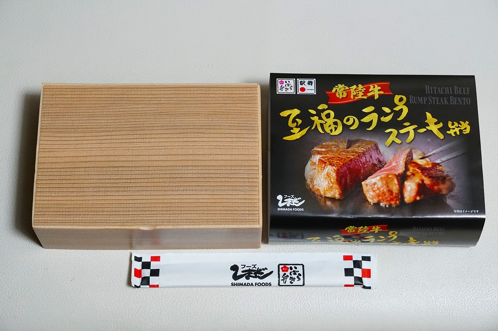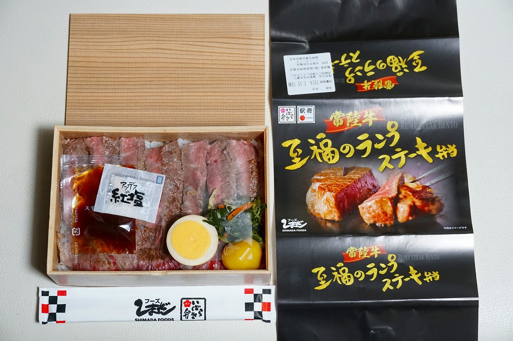 2024(令和6)年1月の京王百貨店の駅弁大会と2月の阪神百貨店の駅弁大会で、これと「至福のランプステーキローストビーフ贅沢盛り弁当」と「常陸牛至福のランプステーキとすき焼き弁当」を実演販売。長方形の容器に白飯を詰め、常陸牛のランプステーキを切り並べて覆い、ナムルやクリなどを付合せ。柔らかく薄造りで食べやすく、タレでなく身と塩で味わえる、高価でおいしい牛ステーキのお弁当だった。水戸駅で売られることは、あるのだろうか。