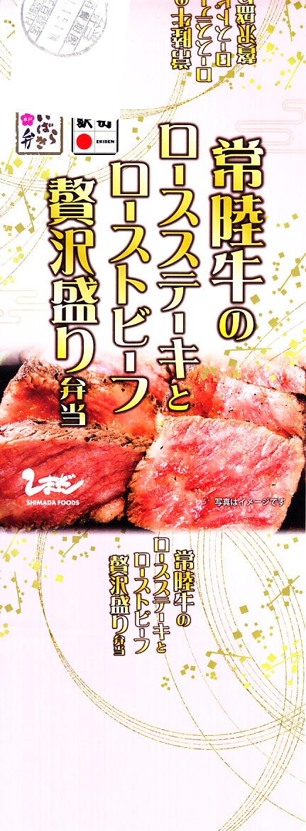 2023(令和5)年1月の京王百貨店の駅弁大会で、これと 「常陸牛のロースステーキとすき焼き弁当」と「常陸牛のロースステーキとローストビーフ贅沢盛り弁当」の3種を、水戸駅の駅弁として実演販売。最も高価なこれは、長方形の容器に白飯を詰め、常陸牛のロースステーキで覆い、くりと青菜と煮玉子とタレと紅塩を添え、食材の写真が美しい黒い掛紙を巻いた。まだ赤くて噛み切れない牛ステーキが印象的で、こんな駅弁は見たことがない。駅弁を売る水戸駅のコンビニで見ることが、できたかどうか。同月の阪神百貨店の駅弁大会でも販売した。
