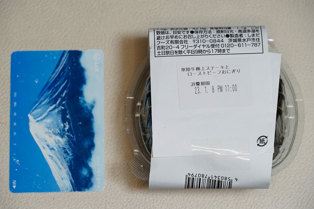 2023(令和5)年1月の京王百貨店の駅弁大会で販売。現物からは読み取れないが、「SDGs×駅弁」として「人気駅弁の端材おにぎりでフードロス削減」と広告し、3種類または5種類のおにぎりを輸送販売した。これは今回の駅弁大会で水戸駅弁として実演販売した3種のローストビーフ弁当のものと思われ、白飯に常陸牛のロースステーキとローストビーフを詰めて海苔でぴったり巻いた、固く締まる丸いおにぎりを1個、プラ製ケースに収めて掛紙を巻いたもの。いつかどこかで売られるように、なるかどうか。