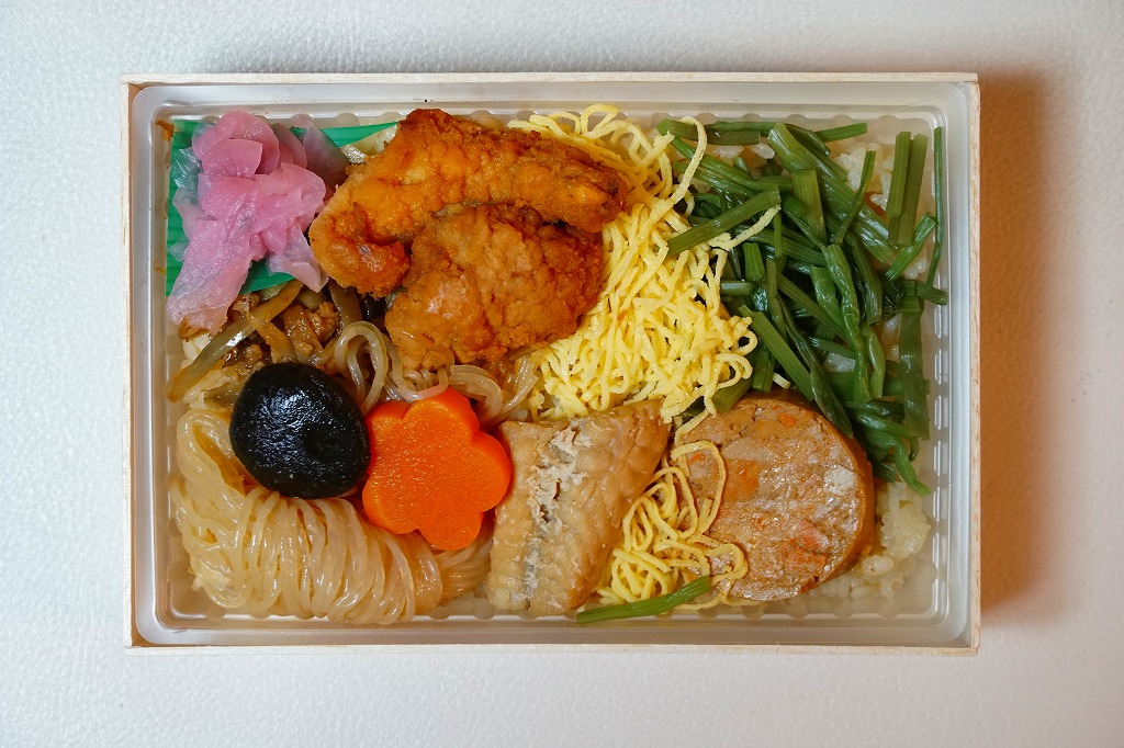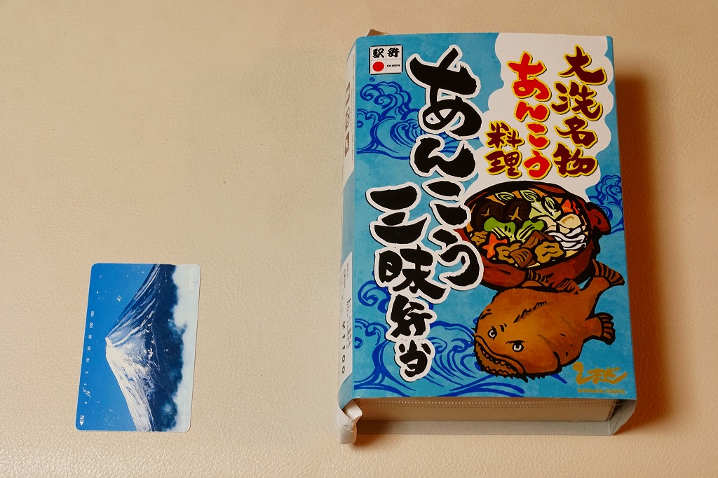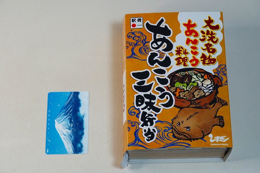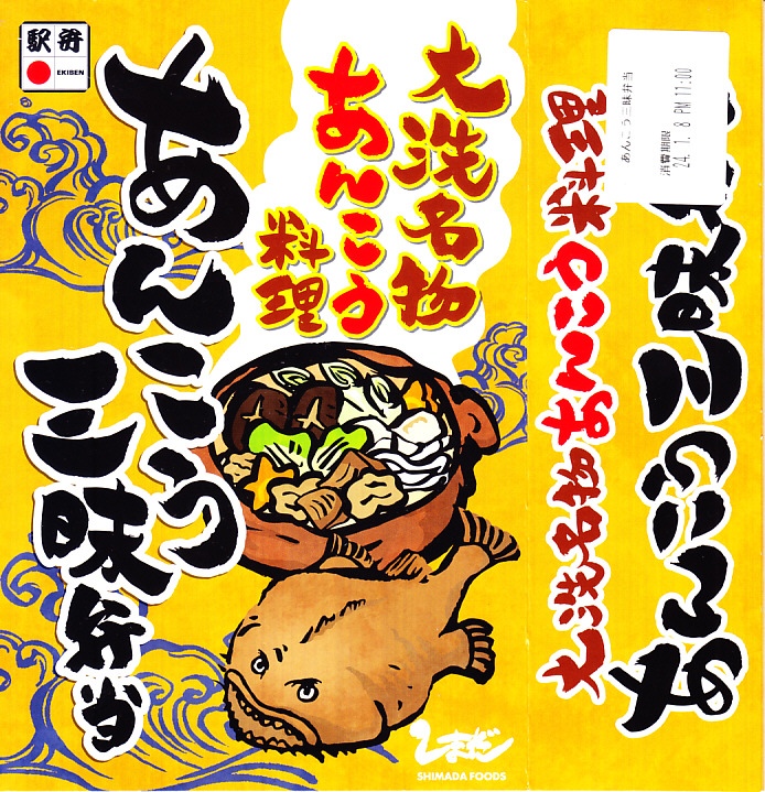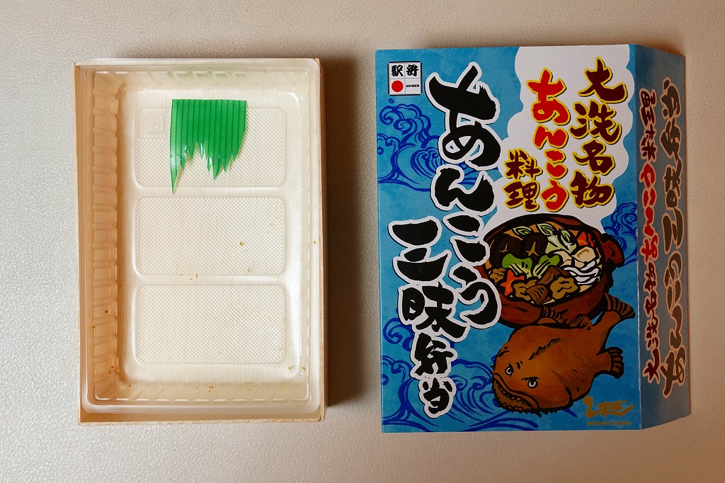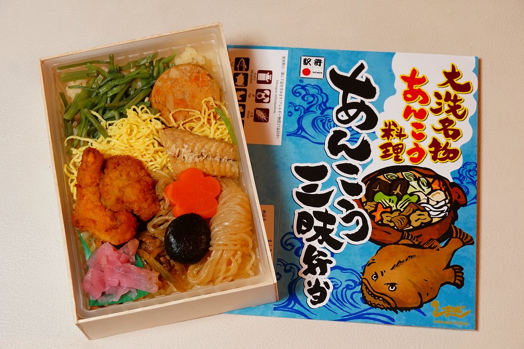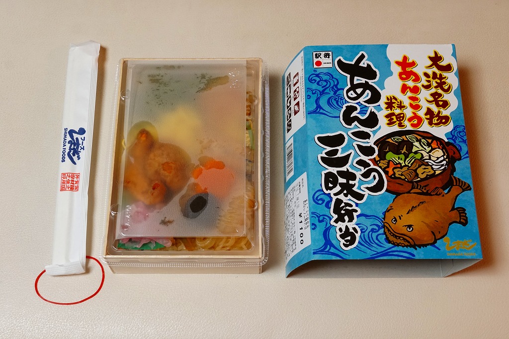 JR東日本の駅弁キャンペーン「駅弁味の陣2019」へのエントリーに向け、2019(令和元)年10月1日に水戸駅や勝田駅と東京駅で発売。ここでは茨城県東茨城郡大洗町の名物とする、茨城県北部や福島県の太平洋岸で親しまれるアンコウを主題にした、とても珍しい駅弁。四角い容器に味噌炊込飯を詰め、アンコウの唐揚げ、アンコウの味噌煮、あんきも(アンコウの肝)煮を載せ、ささがきごぼう、しらたき、ミツバ、しいたけ、にんじん、錦糸卵、大根桜漬を添える。食堂でなく弁当で、あんきもが食べられるとは驚いた。うまく知名度が広まれば、例えば駅弁味の陣で駅弁大将軍に選ばれれば、水戸駅の冬の名物駅弁になるのではないかと思う。価格は2019年の発売時や購入時で1,100円、2023年時点で1,200円、2024年9月20日から1,280円。