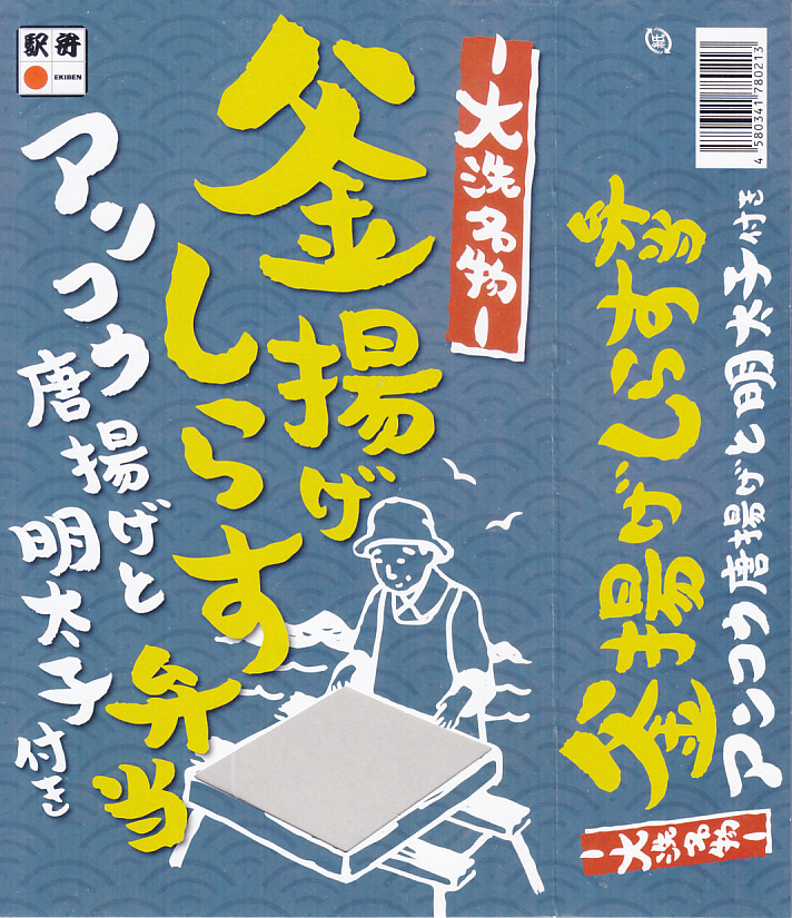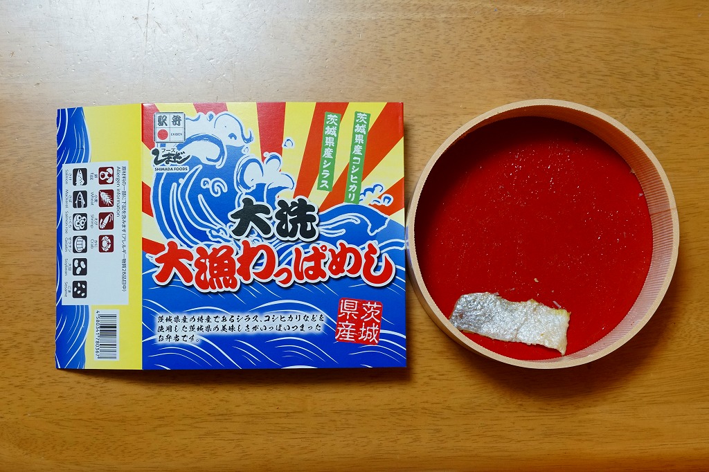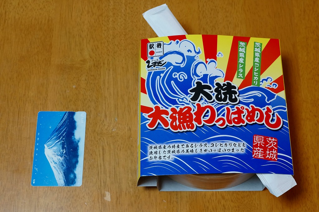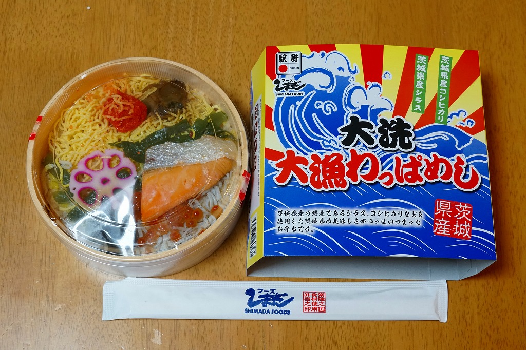 秋冬の駅弁大会シーズンに向けた、2019(令和元)年秋の新商品か。大洗と書いてあるが、大洗駅ではなく水戸駅の駅弁である。スリーブはまるで漁船の大漁旗のような、おめでたい絵柄。中身は茶飯を焼鮭、ハマグリ、明太子、イクラ、シラス、錦糸卵などを散らして覆うもの。見たと違い、具が少なめ、飯のおかずになるようなものが少なめなので、錦糸卵で御飯を食べ進めたような感じ。2シーズン販売し、2021年春に終売か。