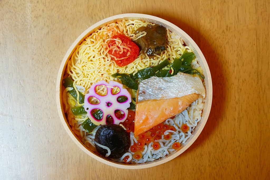木製のわっぱをイメージしたプラスティック製の円形の容器の中身は、茶飯の上にサイコロ上の鮭・こんにゃく・椎茸・イクラ・栗が乗る。具の大きさが小粒で、東北・北海道方面の鮭弁当と比較すると鮭が小さくイクラが少ないが、鮭・イクラ・茶飯やその他の具はしっかりした味を出していて、おいしくいただける。ただ、容器の底は球形でかなりの上げ底になっているのはいただけない。なお、2002年にこの業者が駅弁販売から撤退したため、現在は入手できない模様。