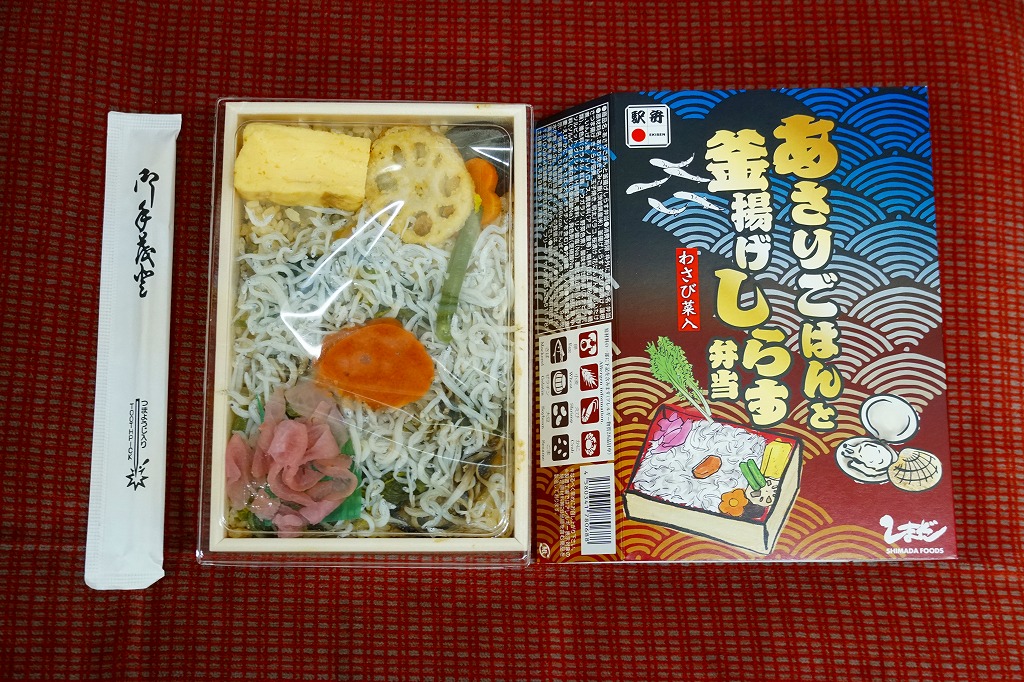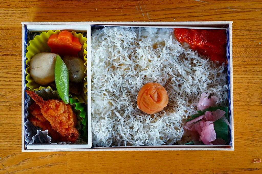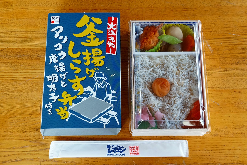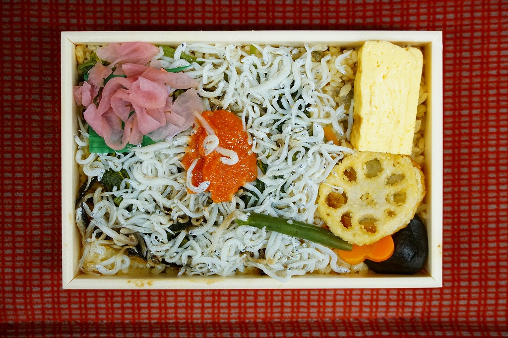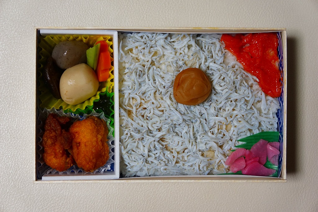 長方形の容器に御飯を詰め、シラスで覆い、梅干しを据えて、明太子ペーストと大根桜漬を添えて、おかずに煮物とアンコウ唐揚を置く。分かりやすくて食べやすく、シラスの駅弁として浜松駅や大船駅より充実感があった。価格は2017年の発売時や2019年の購入時で1,050円、2020年時点で1,100円、2023年時点で1,250円、2024年9月20日から1,350円。