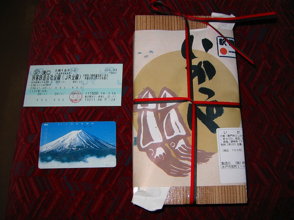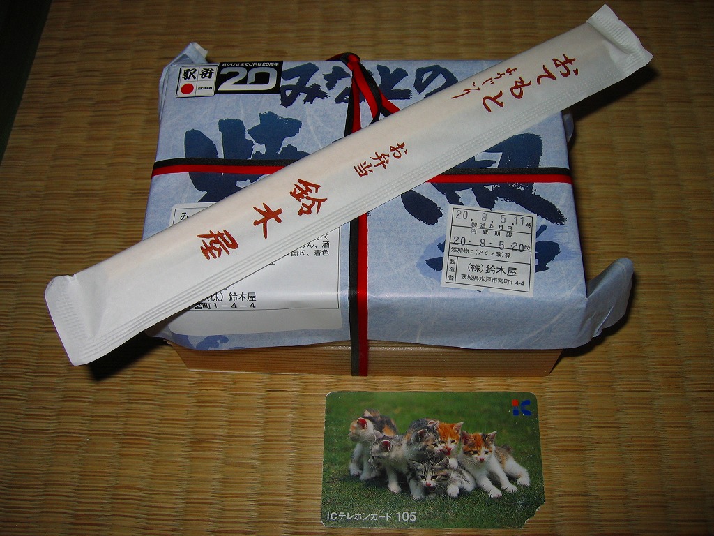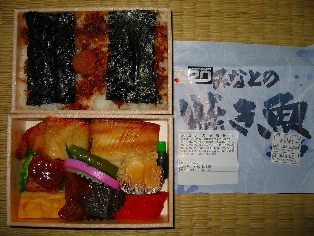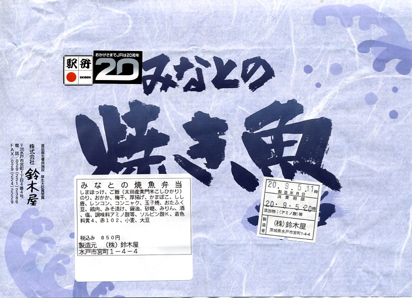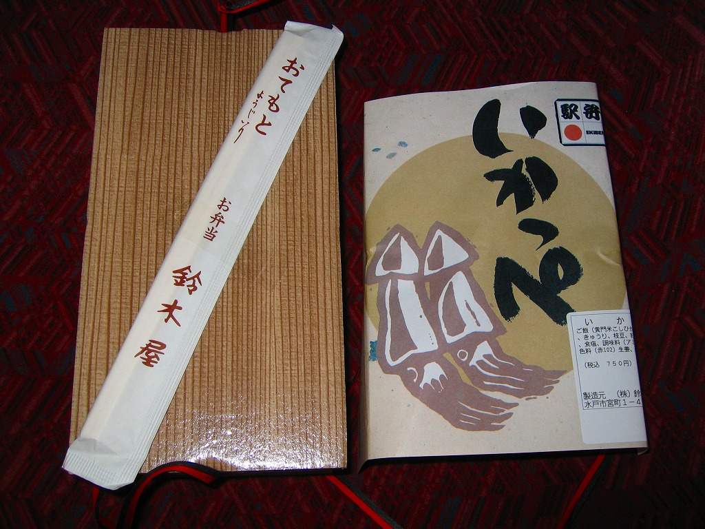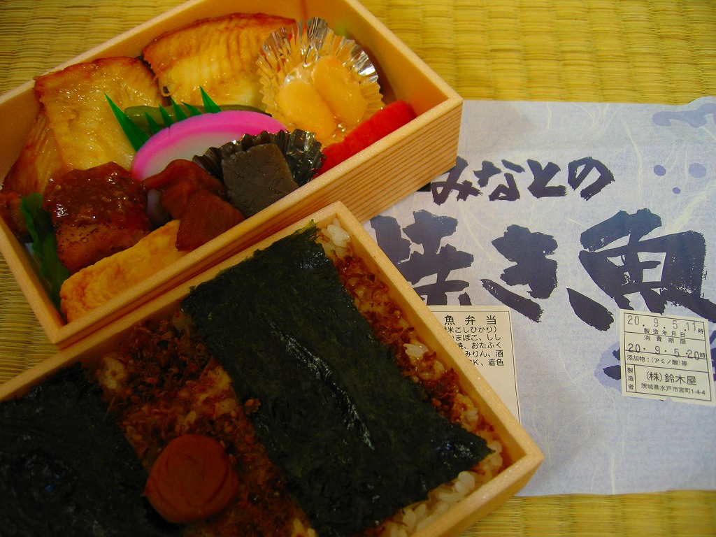 JR東日本発足20周年記念駅弁の水戸駅鈴木屋版として、2007(平成19)年の夏に発売。小柄な長方形の木目柄容器を2段に重ね、商品名を書いた青い掛紙をかけて、ひもで十字にしばる。中身は下段が黄門米コシヒカリを使用した海苔弁タイプのおかかごはん、上段がしまほっけの焼き魚に玉子焼、鶏照焼、カマボコ、レンコンとこんにゃくの煮物、煮豆にタクアンなど。焼き魚をメインとした駅弁は珍しく、しまほっけの風味と分量が素晴らしい。