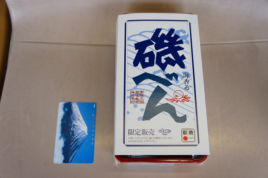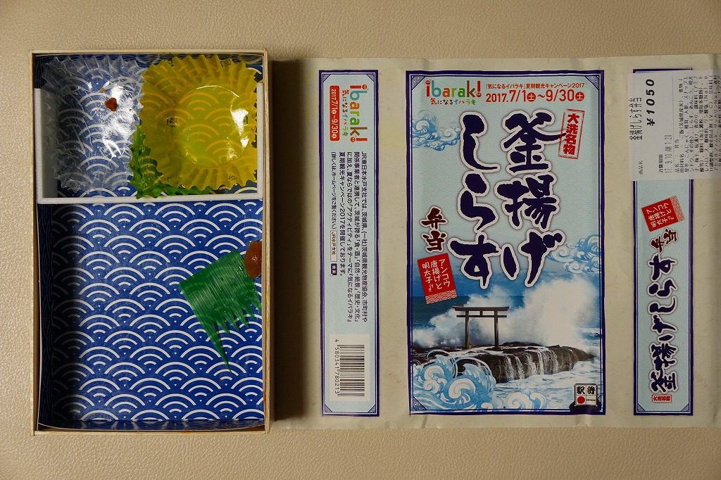 2017(平成29)年9月9日に購入した、水戸駅弁の掛紙。発売当時はボール紙枠でなく掛紙を使用し、掛紙で大洗の太平洋と磯前神社の鳥居を描いていた。