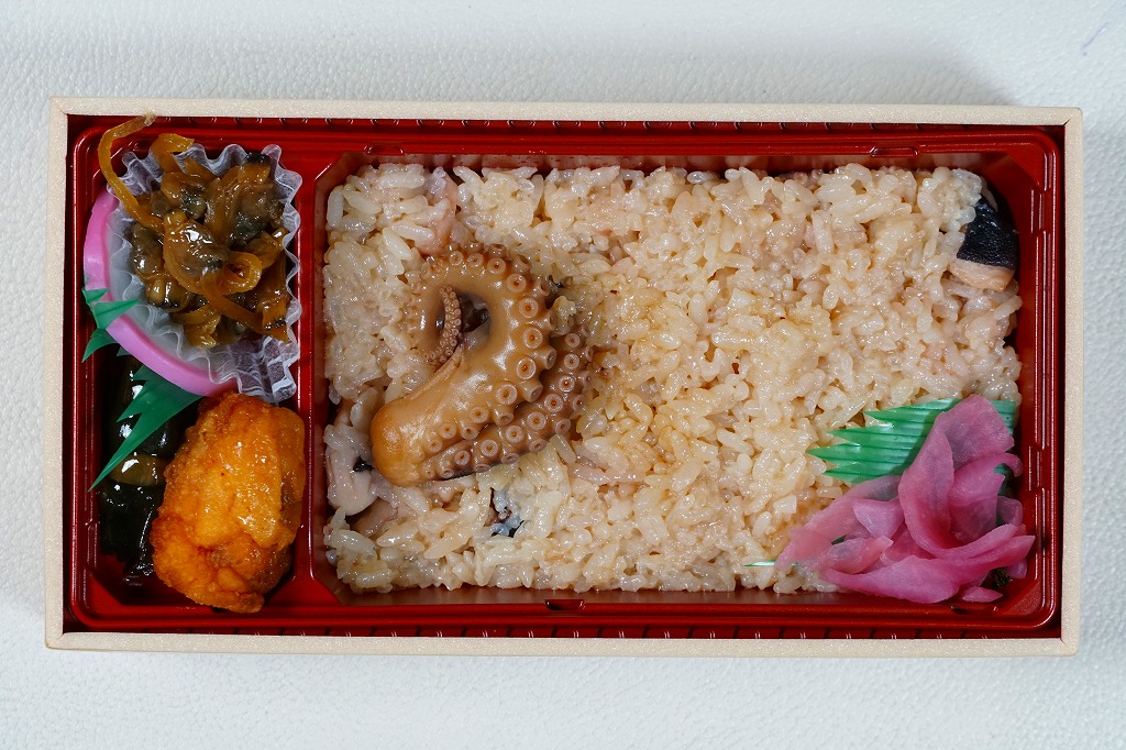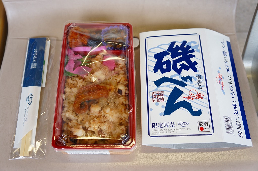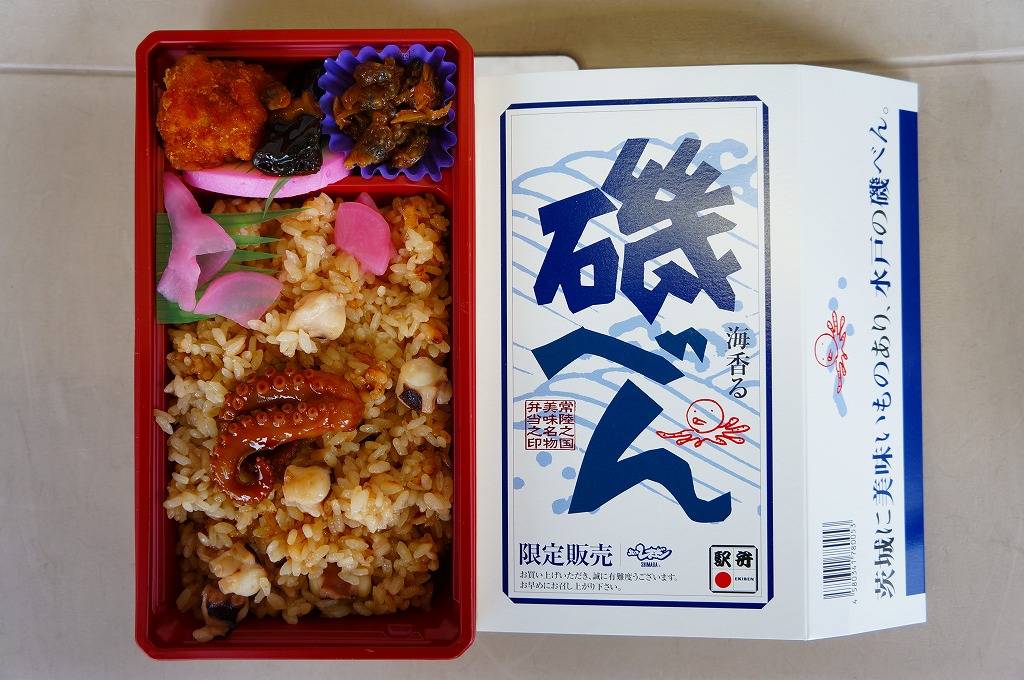2011(平成23)年4月までに、水戸駅で発売か。パッケージに「限定販売」とあるが、水戸駅ではいつでも買える。赤黒いプラ製トレーを接着した長方形の容器に透明なふたをして、駅弁の名前を大きく描いた白いボール紙の枠にはめる。中身はタコの炊込飯にアンコウの天ぷらとアサリの佃煮などを添えるもの。淡く甘く柔らかく、シンプルで一気に食べられる味。同時に発売の「牛べん」と見た目は似るが、方向性はまるで異なる。価格は購入時で1,000円、2014年時点で1,050円。2019年までの販売か。