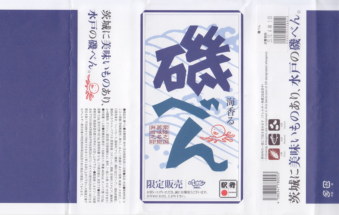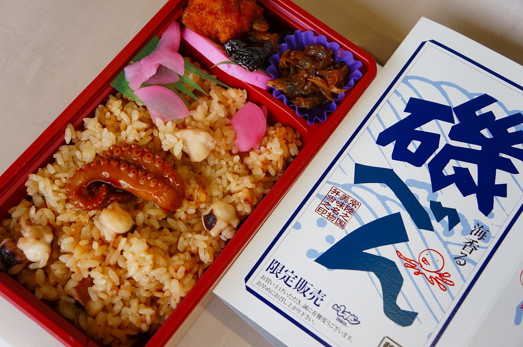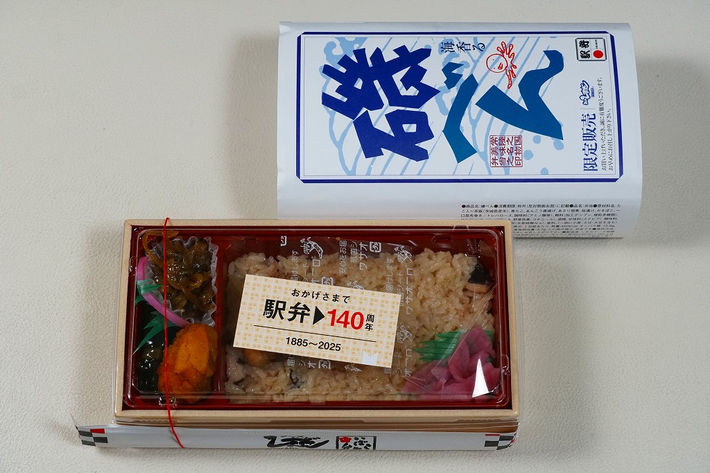 日本鉄道構内営業中央会が駅弁誕生140周年を記念して、会員のうち34社が原則として2025(令和7)年10月1日から販売した、復刻をテーマにした駅弁の、水戸駅弁のしまだフーズバージョン。加えてJR東日本の駅弁キャンペーン「駅弁味の陣2025」にエントリーし、10月1日から11月30日まで販売した。上記のとおり2011年から2019年まで売られた水戸駅弁「磯べん」の復刻。当時のスリーブは掛紙になり、価格も上がったが、中身はそのまんま、タコの炊込飯にアンコウの天ぷらとアサリの佃煮などを添えるものだった。また消すには惜しい美味。同時に発売の「牛べん」とは違い、こちらは販売が続かない。