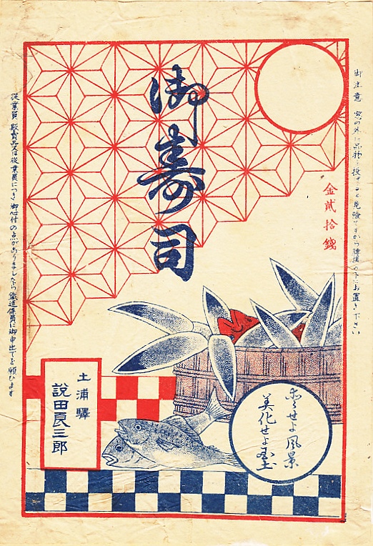 1930年代、昭和10年前後のものと思われる、昔の土浦駅弁の掛紙。収集者は1918(大正7)年のものとしていた。調製印のサイズで印刷された「愛せよ風景 美化せよ国土」の標語は当時の、昭和恐慌後から日中戦争前くらいの間の鉄道省の当選標語だそうで、一部の駅弁掛紙に記載される。
