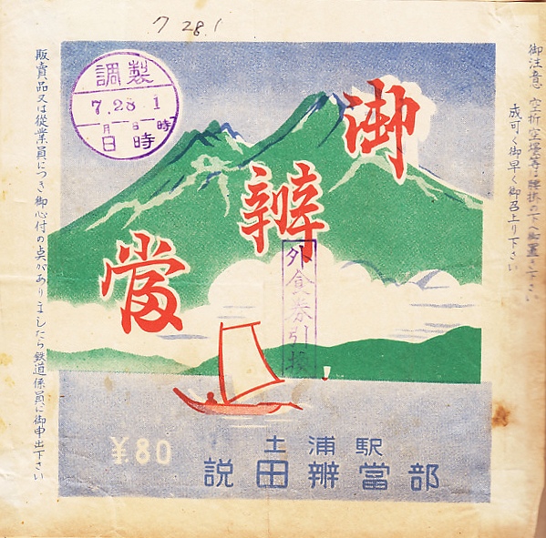 1950年代、昭和30年前後の、7月28日1時の調製と思われる、昔の土浦駅弁の掛紙。収集者は1954(昭和29)年のものとみなした。こんなに見事には見えないと思うが、霞ヶ浦と筑波山を描いたのだろう。月日時のみの調製印に加えて、外食券引換の印を押す。