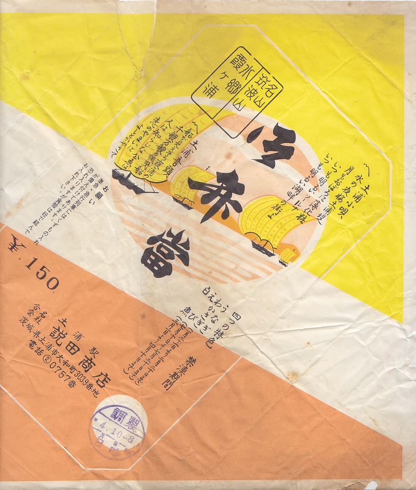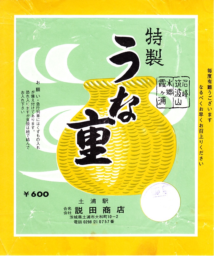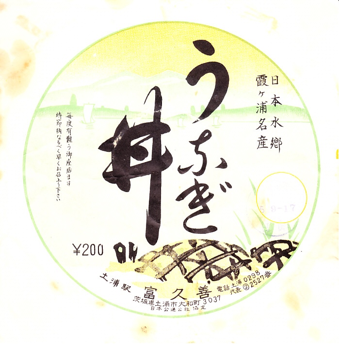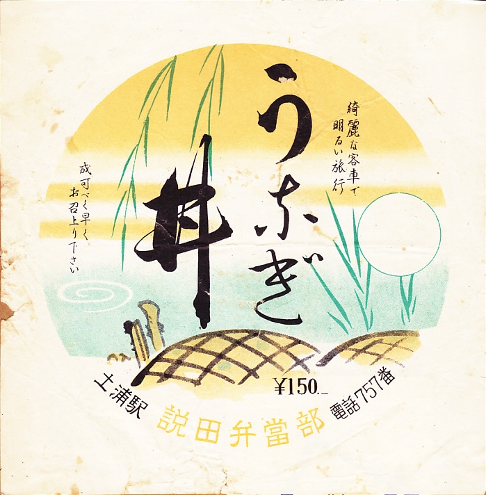 昭和30年代、1960年前後のものと思われる、昔の土浦駅弁の掛紙。土浦の電話に市内局番が付いた1965(昭和40)年頃より前のもの。収集者は1954(昭和29)年9月のものとみなした。その絵柄は、もうひとつの土浦駅の駅弁屋であった富久善のものとそっくりで、21世紀に売られたものとたいして変わらない。駅弁の掛紙には稀な丸い形も変わらない。