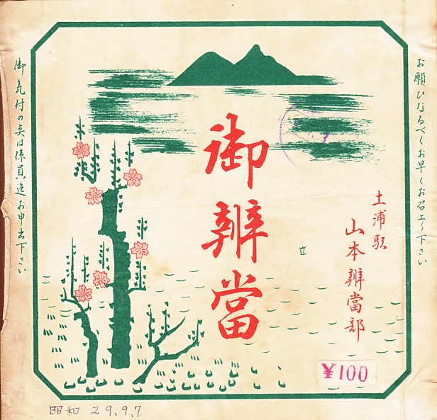 1954(昭和29)年9月7日の調製と思われる、昔の土浦駅弁の掛紙。収集者が調製印に加え、調製年月日を書き入れた。梅か桜と霞ヶ浦と筑波山を描いたように見える。同じ茨城県内で同じ常磐線沿線で、偕楽園という名所があるため、存在が霞みがちではあるが、土浦市内の亀城公園、江戸時代の土浦城の跡地もまた、梅や桜の名所である。
