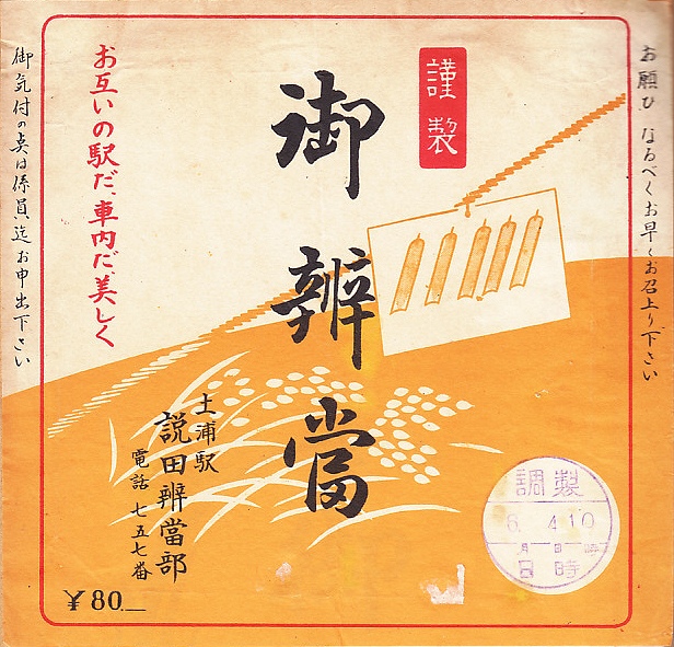 1950年代、昭和30年前後の、6月4日10時の調製と思われる、昔の土浦駅弁の掛紙。稲穂を描く、日本中どこでも使えそうな絵柄。今も土浦は稲作も行われる土地であり、茨城県産のコシヒカリ、あきたこまち、ミルキークイーンが首都圏へ出荷される。