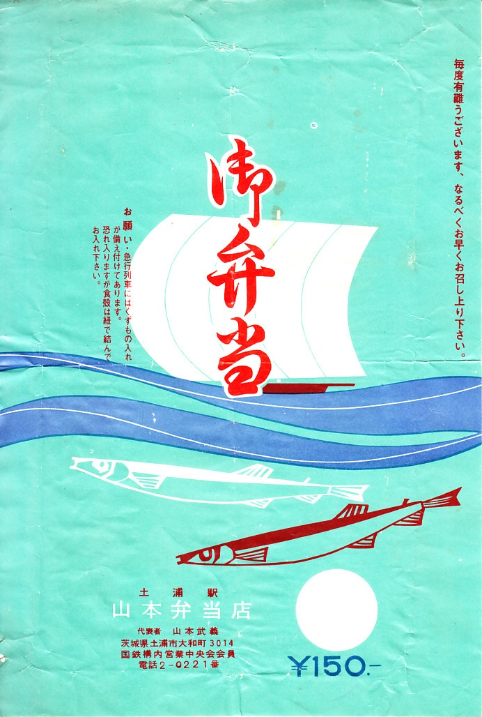 1965年頃のものと思われる、昔の土浦駅弁の掛紙。霞ヶ浦の帆掛け船と、ワカサギか何かの魚を描く、青い掛紙。
