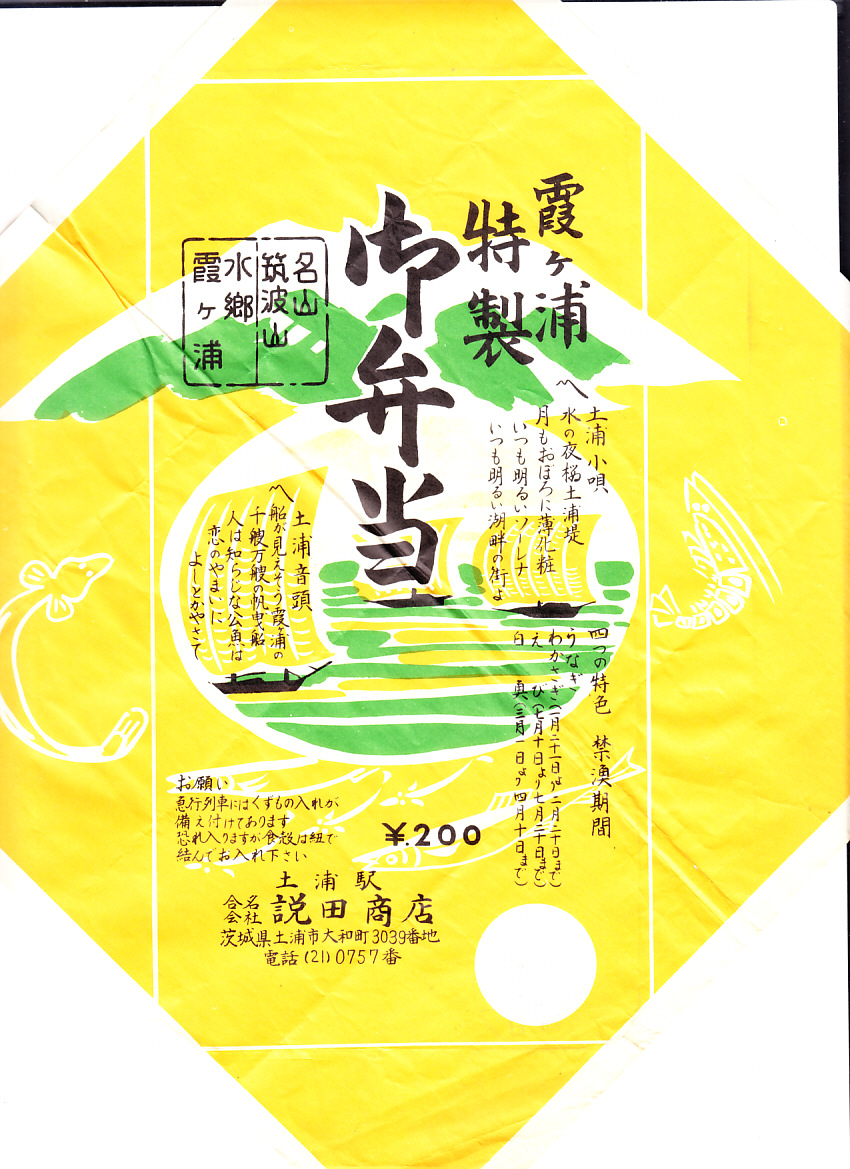 1960年代の、4月10日8時の調製と思われる、昔の土浦駅弁の掛紙。霞ヶ浦に浮かぶ帆引き船の風景に、土浦小唄や土浦音頭の歌詞を重ねた。