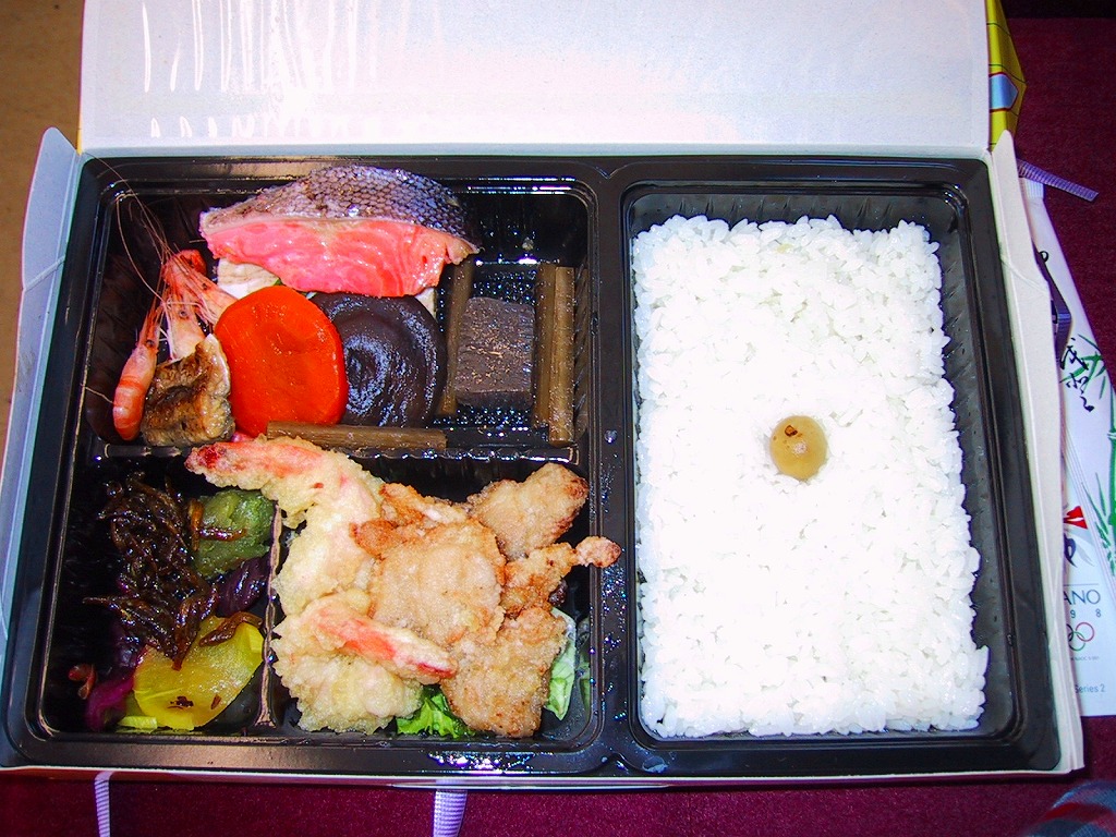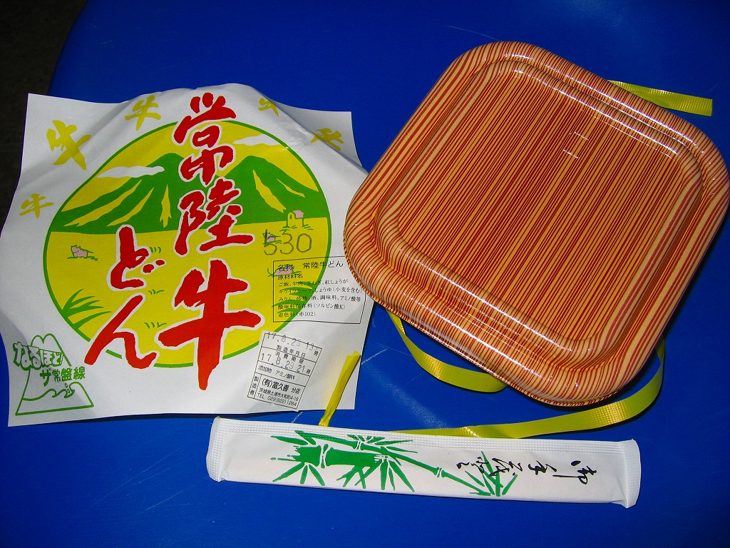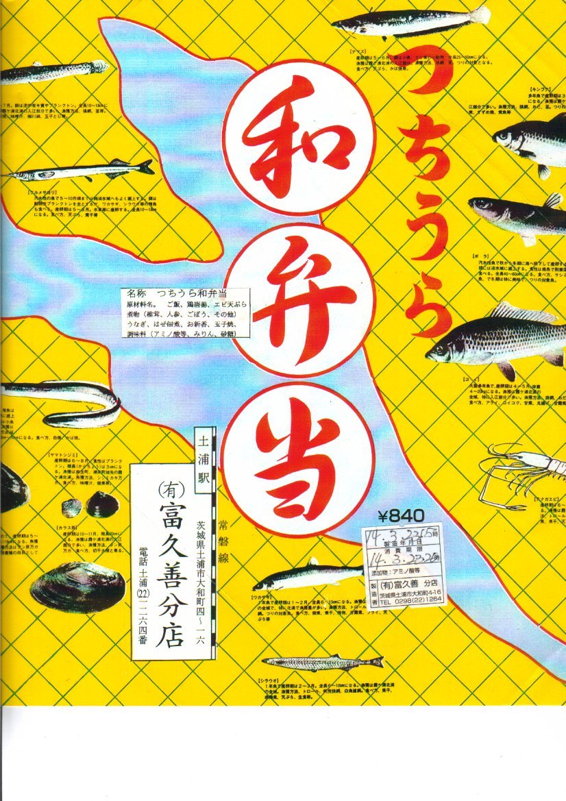 土浦駅の幕の内駅弁。カラーコピーの掛紙に市販の折詰弁当箱を使用、中身は白御飯に焼き魚・エビフライ・鶏唐揚・小海老に椎茸などの煮物、そして土浦駅弁らしく小さな鰻蒲焼が入る。価格の割に内容は豊富で、素材は良さそうなのに、水気が多すぎて全体的にべちゃついており、残念の一言。適度に水気を吸う経木の容器に入れればおいしそう。この駅弁は調製元の廃業により、2012年2月頃までに失われた。