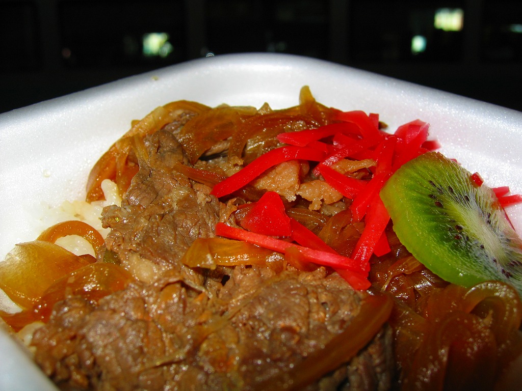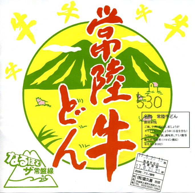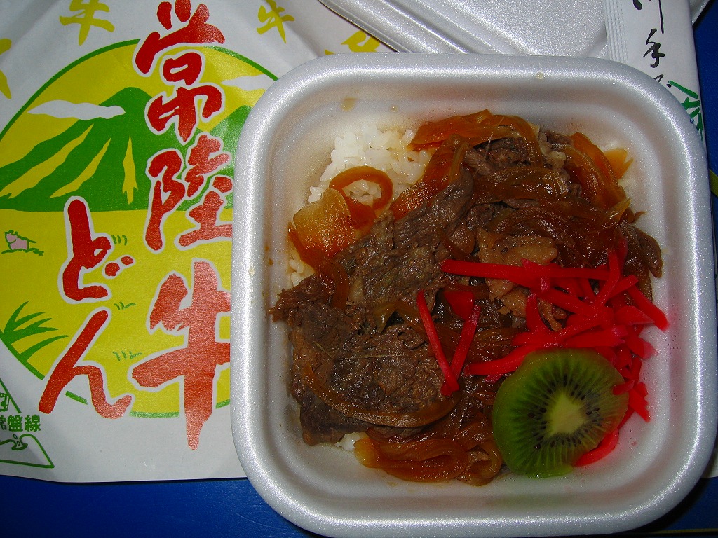 牛丼チェーン店風の容器にカラーコピーの掛紙をかけて、ビニールひもでしばる。価格は掛紙に手書き、十数年は前のキャンペーン「なるほど!ザ常磐線」ロゴも踊る。中身は牛丼で、キウイの添付が特徴。暖かくないと食べられたものではないという悪評や、時代に流されない個性的な内容だとか、時間が止まったような駅弁売店とともに、半ば伝説的に語られた駅弁。