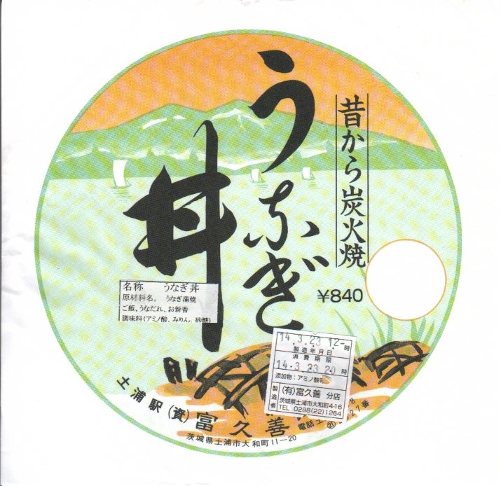 土浦駅弁の代表的存在。土浦駅では1902(明治35)年からウナギの駅弁が売られたようで、全国最古のウナギ駅弁という考察がある。ファストフードの牛丼弁当のような丼の中身は、御飯とタレとウナギの蒲焼だけのシンプルな構成。掛紙に「昔から炭火焼」とあるとおり、ウナギの蒲焼は本当に炭火焼きのようで、おこげの香ばしさは秀逸だった。価格は2002年の購入時で840円、2006年頃から1,000円。この駅弁は調製元の廃業により、2012年2月頃までに失われた。
