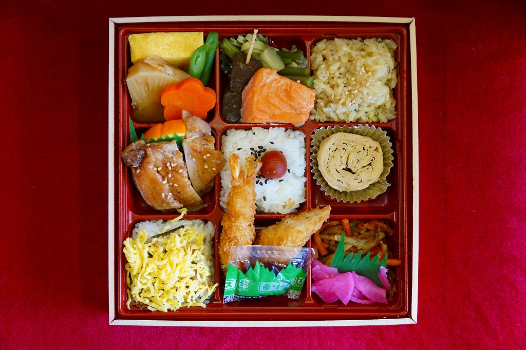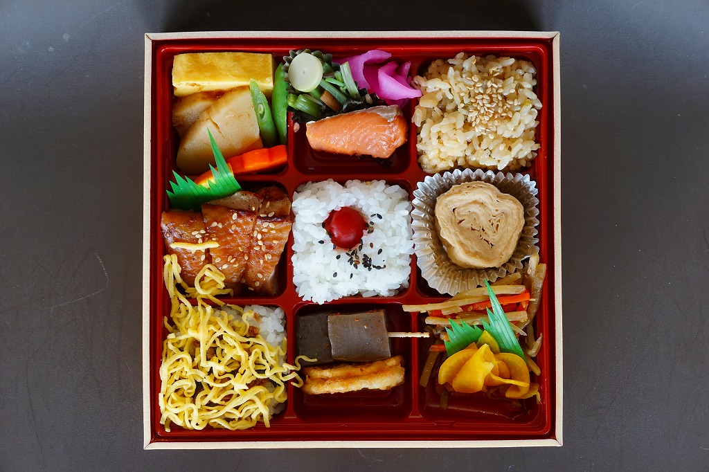 9区画の中身は、日の丸御飯、茶飯、そぼろ御飯で3種の御飯と、湯波(ゆば)、鶏照焼、タケノコとニンジンの煮物と玉子焼、焼鮭と山菜、きんぴらごぼう、ヤマイモの磯部揚とコンニャクなど。