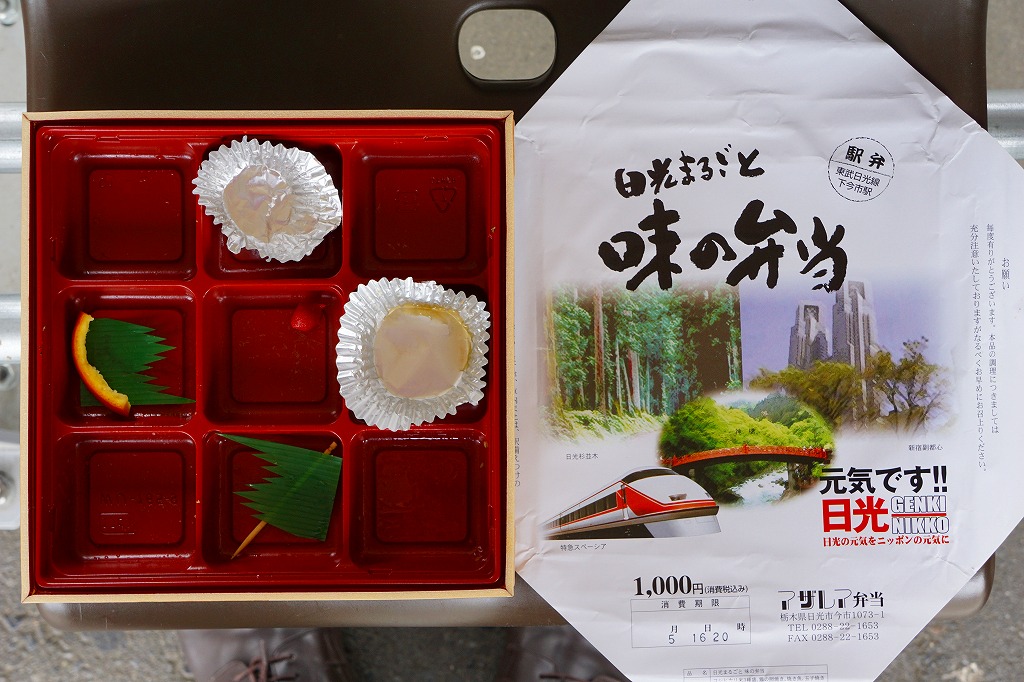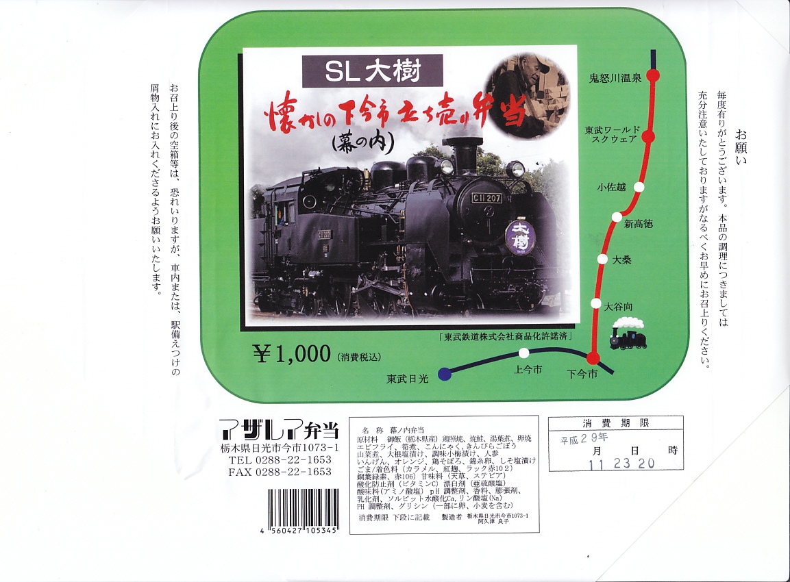 東武鉄道のSL列車「SL大樹」の運行開始に合わせて、2017(平成29)年8月に発売。とはいえ、容器と価格は下記の駅弁「日光まるごと味の弁当」と同じで、中身もほとんど同じ。9区画に日の丸御飯、茶飯、そぼろ御飯で3種の御飯と、湯波(ゆば)、鶏照焼とオレンジ、タケノコとニンジンとインゲンの煮物と玉子焼、焼鮭と山菜とこんにゃく、きんぴらごぼうと大根桜漬、エビフライ。掛紙はSL大樹の写真と路線図、駅弁の名前にはかつての駅弁立売の名を入れた。東武日光駅と下今市駅の売店で売られた。2019年までの販売か。
