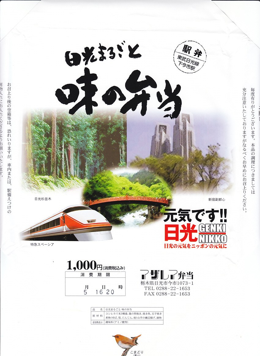 JR東日本・東武鉄道特急列車直通運転一周年記念弁当として、2007(平成19)年3月18日から6月30日まで販売された期間限定駅弁で、このとおりその後も販売が続く。掛紙の絵柄は日光と新宿の風景と、東武特急スペーシアと、かつては「元気です!!日光」の文字の場所にJR特急電車が掲載されていた。