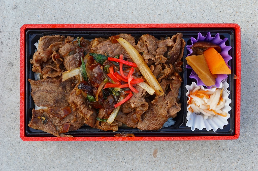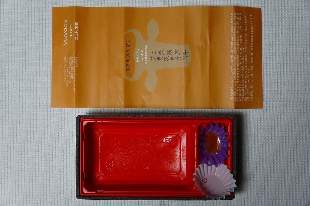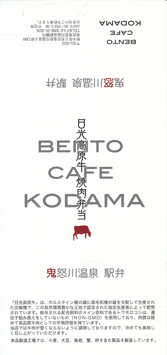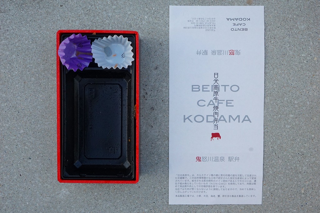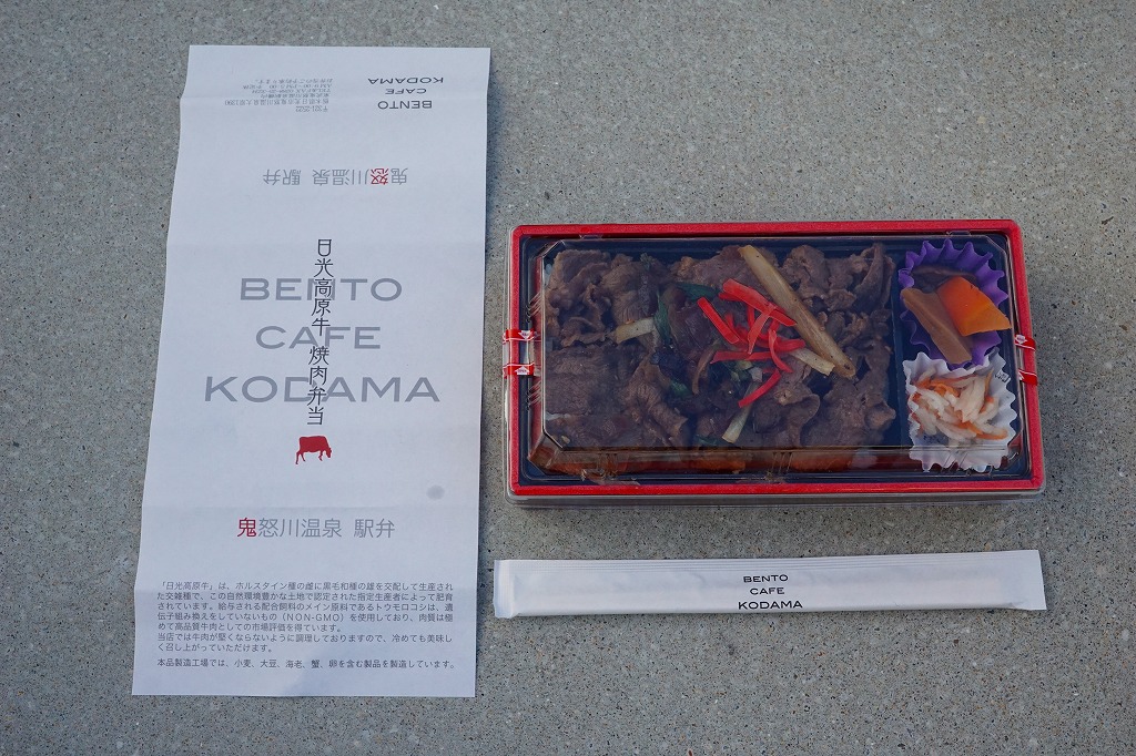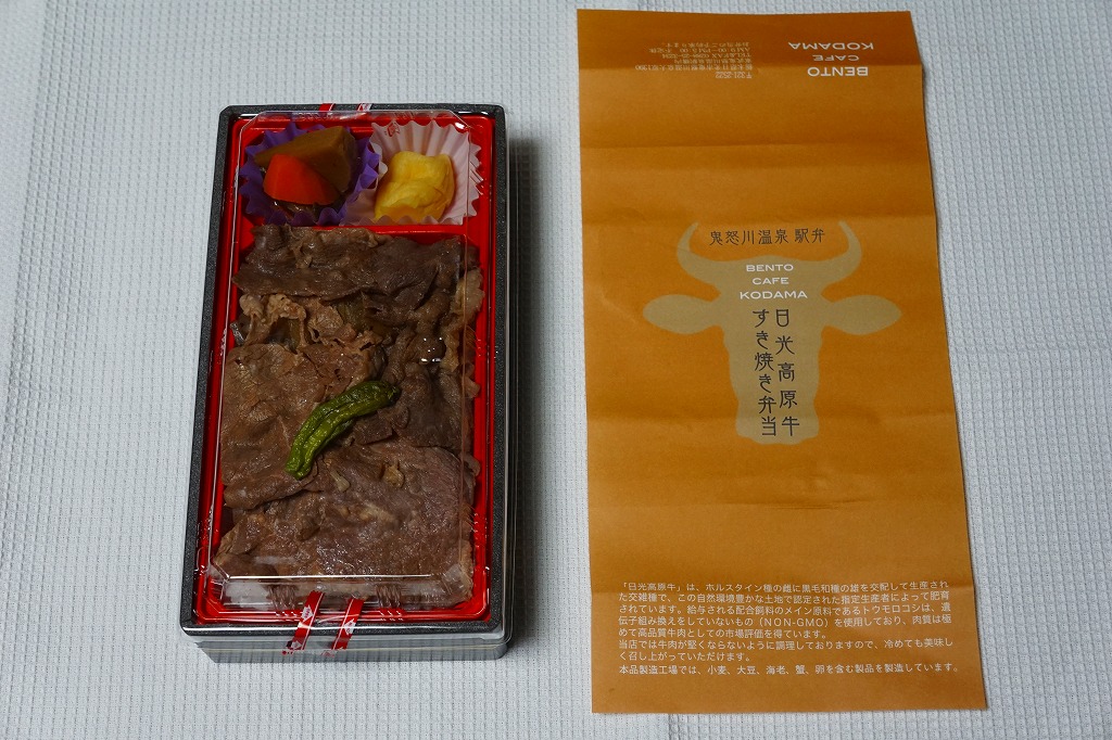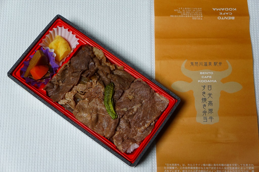 2017(平成29)年の春までに発売か。白くおしゃれな掛紙を巻かれた長方形の容器に白飯を詰め、日光高原牛の焼肉で覆い、煮物や酢の物や炒め物を添える。薄めの肉はしっかり固く、赤身の存在感またはB級感のあるお惣菜。価格は2017年の購入時で1,080円、2020年時点で1,296円、2024年時点で1,728円。