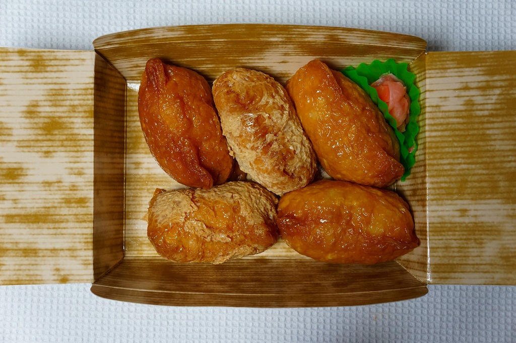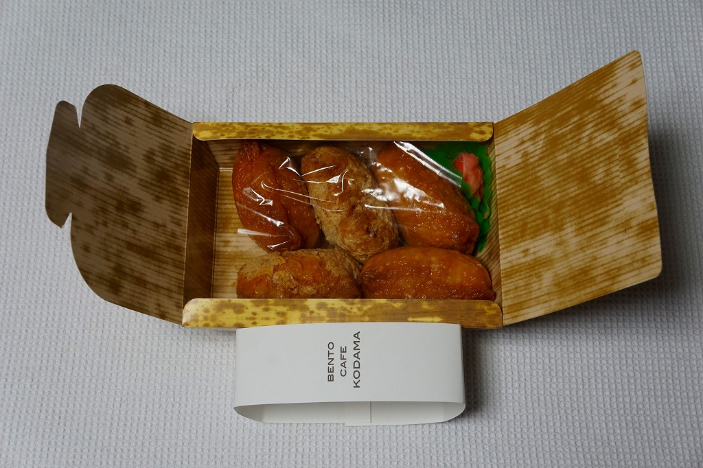 鬼怒川温泉駅で下記の駅弁を売る店舗で買えた稲荷寿司。竹皮柄のボール紙に、おいなりさん5個と生姜を詰めて、カフェの名を記した紙帯を巻いていた。特に解説はないものの、やや小柄な稲荷は油揚げの風味がそれぞれ異なり、味に優れた軽食。御飯ばかりなので腹持ちもする。価格は2018年の購入時で435円、2020年時点で486円、2024年時点で648円。