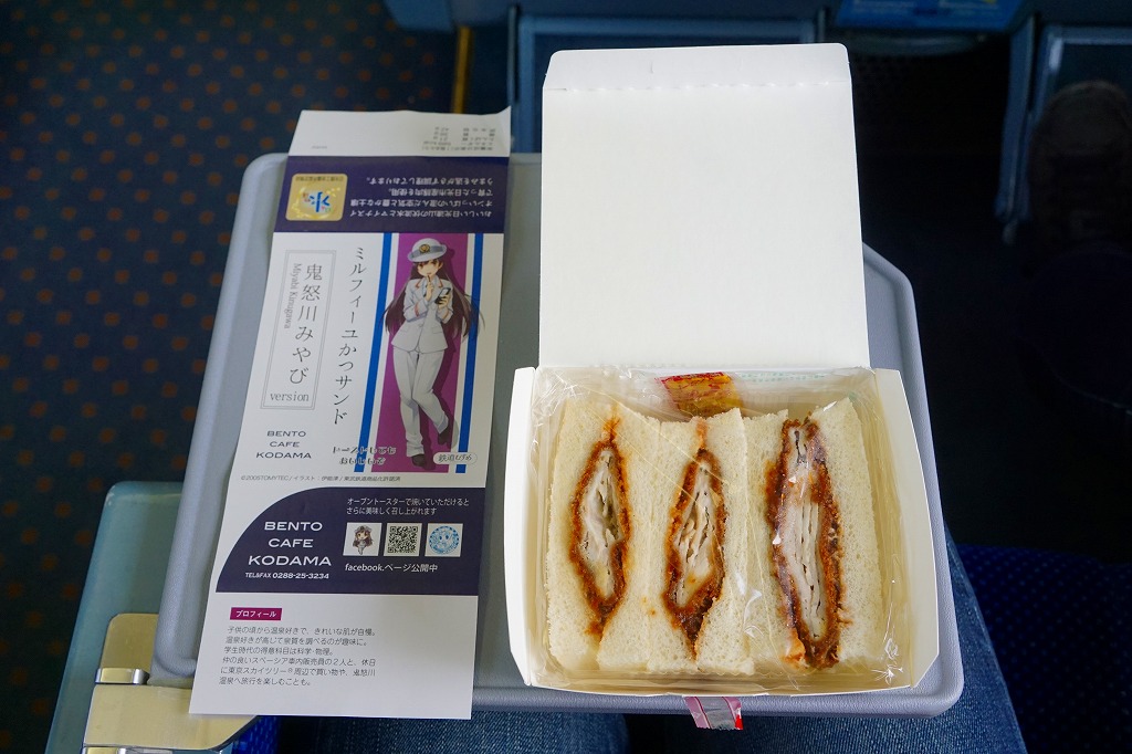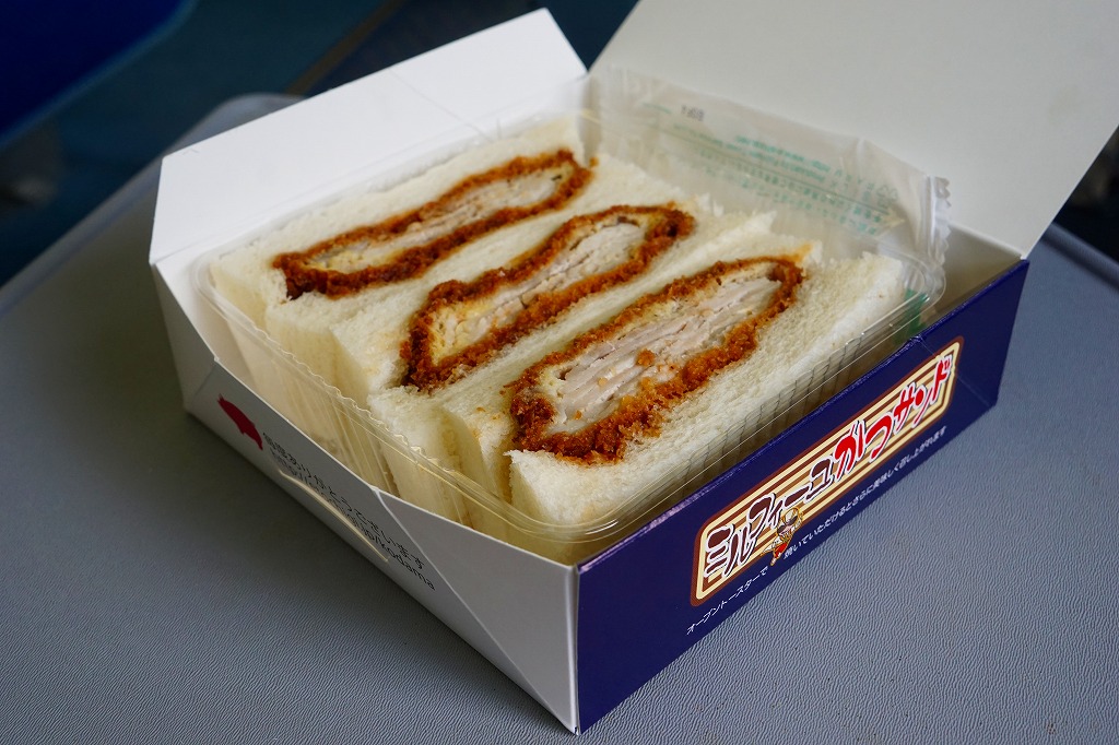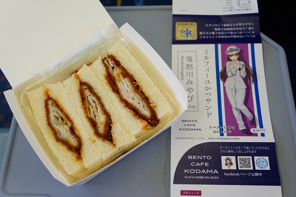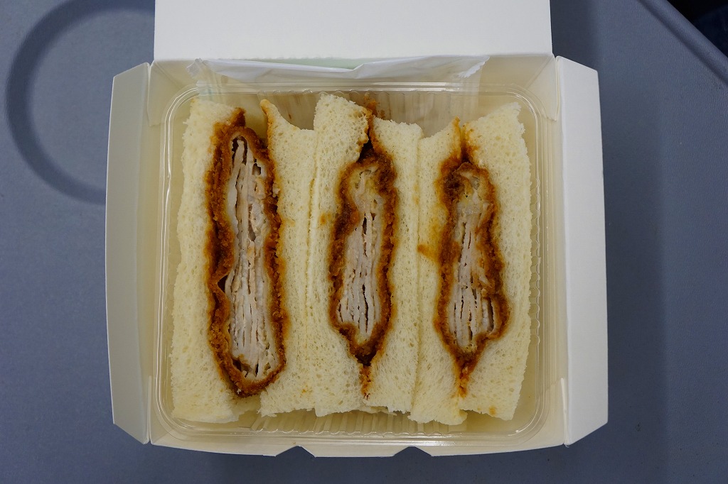 栃木県日光市産の豚肉を薄切りにして重ねて揚げたトンカツを、トーストした耳なしパンに挟んだカツサンドを3切れ、透明なプラ製トレーに詰めた後に紙箱に収める。山梨県の小淵沢駅で人気になった同種の駅弁は脂とタレの味がきつかったが、こちらは肉の量も味も軽め。以下のとおり2015年に3箱まとめて食べても胃にもたれなかった。価格は2014年の発売時で550円、2015年時点で600円、2017年の購入時で615円、2019年時点で650円、2020年時点で680円、2023年時点で702円、2024年時点で918円。