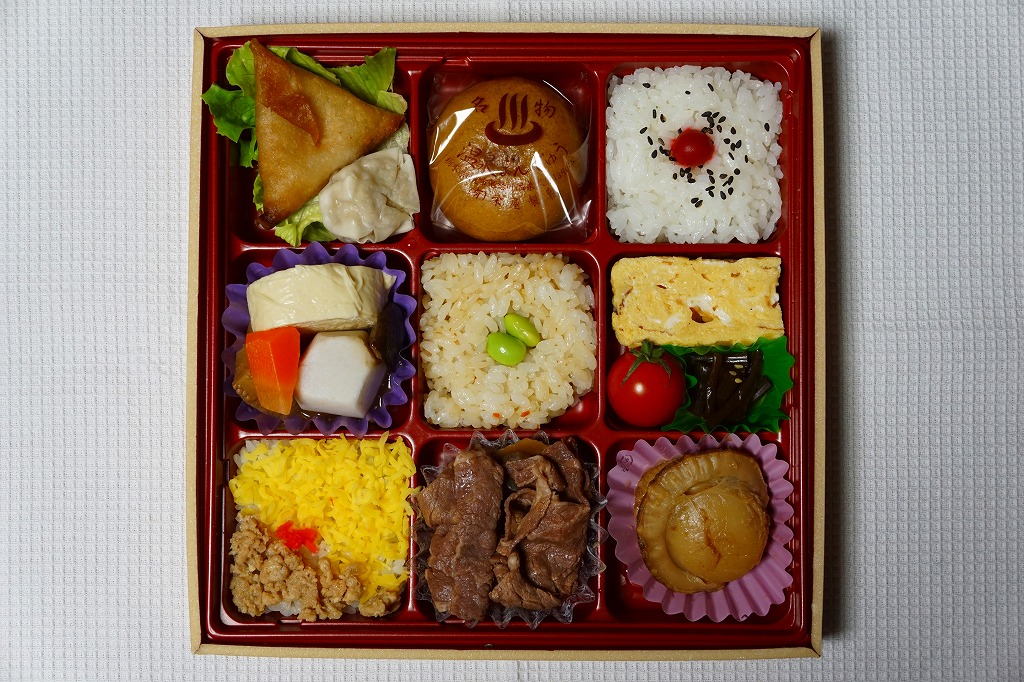 2017(平成29)年の春までに発売か。「谺」には樹木の精霊、木魂、やまびこ、反響という意味があるそうで、この駅弁を売るカフェや調製元の店舗の名前に使われている。美しい掛紙に包まれた正方形のプラ容器の9区画に、日の丸、五目、鶏親子で3種の御飯、牛肉煮、ホタテ、湯波やニンジンやサトイモなどの煮物、玉子焼とミニトマトときゃらぶき、焼売と春巻き、温泉饅頭1個を詰めた、なんでもまるごと弁当。価格は2017年の購入時で1,295円、2020年時点で1,458円、2024年時点で1,890円。