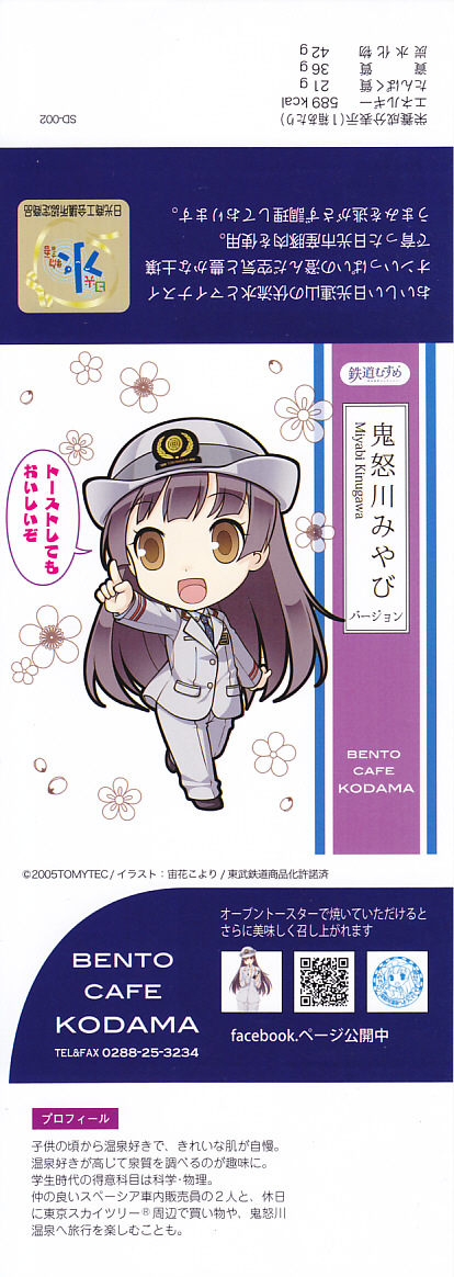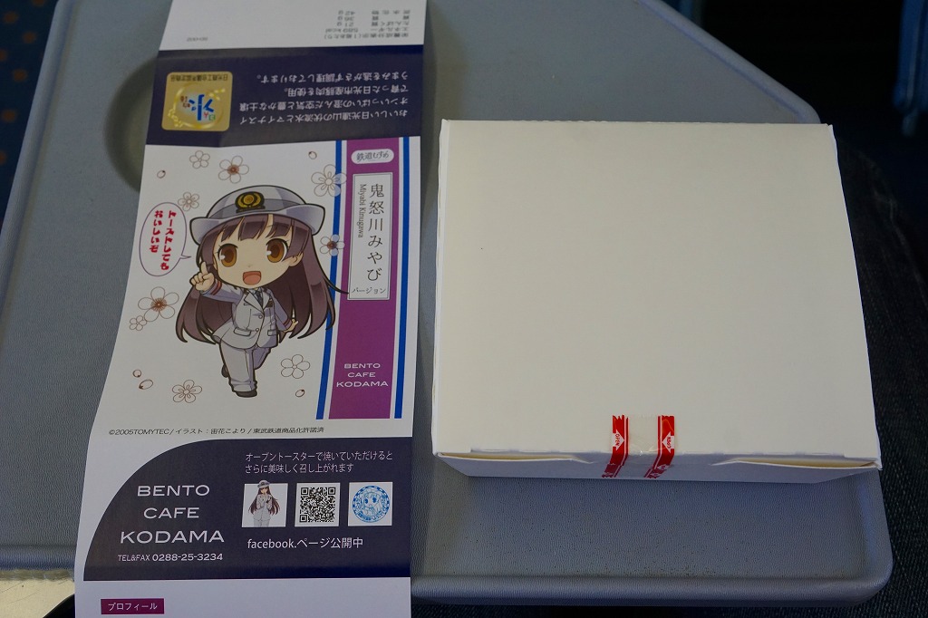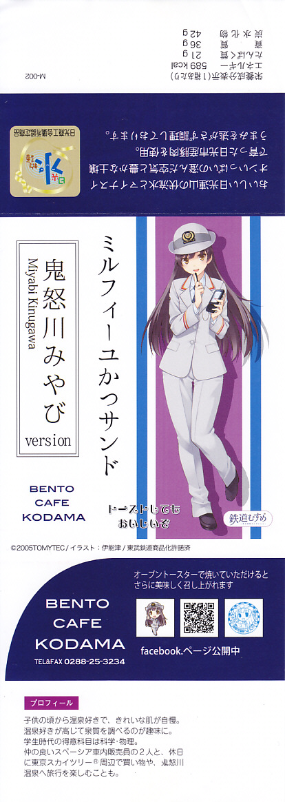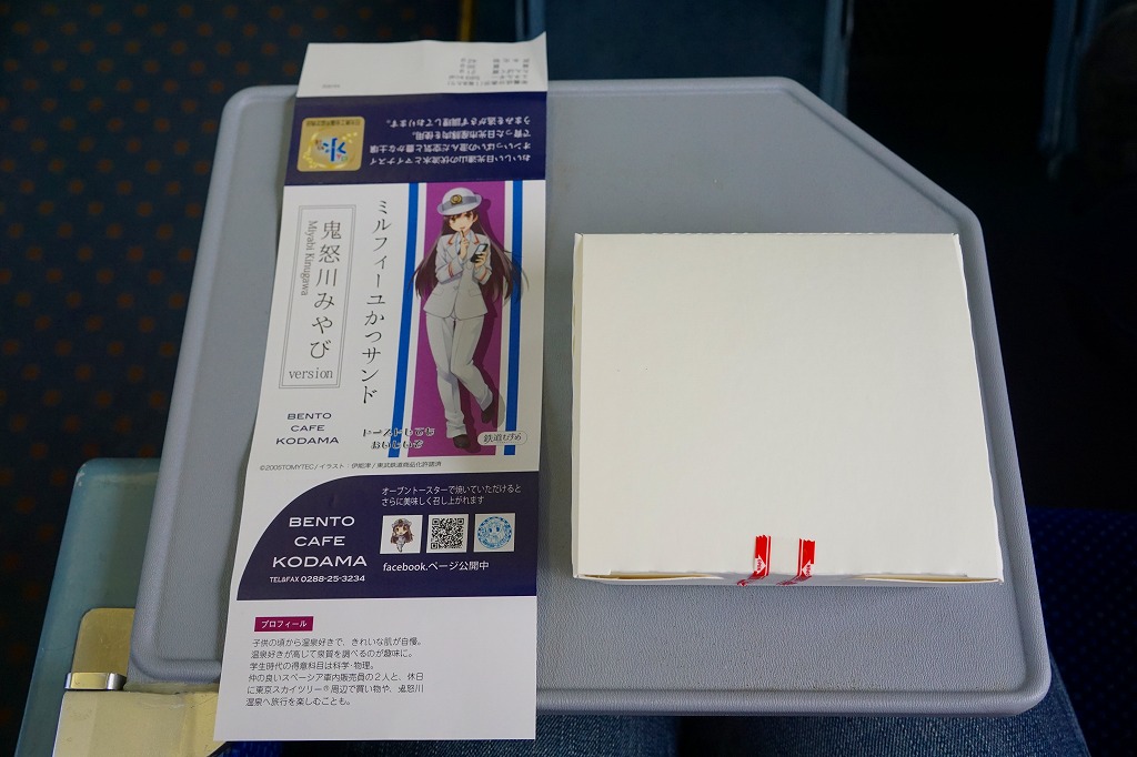 2015(平成27)年5月16日に購入した、鬼怒川温泉駅弁の紙箱。上記の駅弁「ミルフィーユかつサンド」と同じもので、同日に購入した3箱分すべて、容器の構造や中身や値段は同じ。紙箱が真っ白になり、トミーテックの東武鉄道向けキャラクター「鬼怒川みやび」を描いた掛紙を巻いていた。