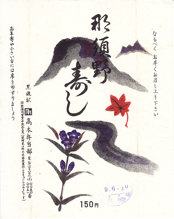 昭和40年代、1970年前後のものと思われる、昔の黒磯駅弁の掛紙。黒磯の電話に市内局番が付いた、1968(昭和43)年頃以降のものか。アユの駅弁、押寿司や姿寿司の駅弁は、第二次大戦前から昭和時代まで、本州や九州の各地で人気だった。