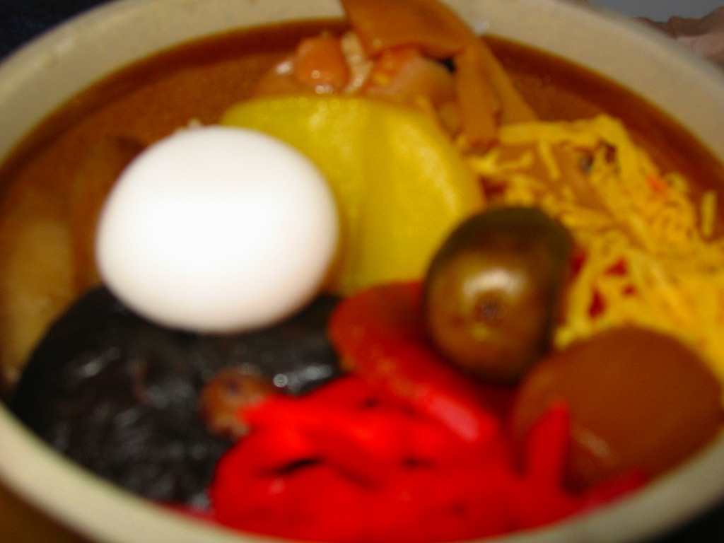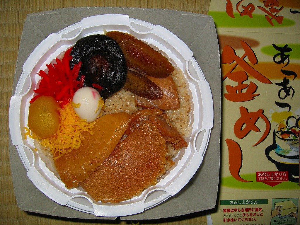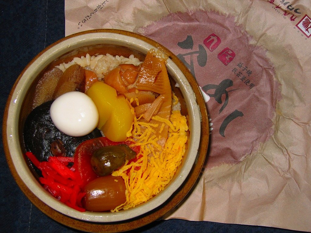食べれば普通の釜飯。しかしふたの向き、ゴムで広がりを押さえた掛紙の見せ方、紙ひものしばり具合、長目の割りばしに大きめのナプキンと、食品表示ラベルの貼り方を除き、釜飯駅弁としての外観の整然さは日本一級かと。そういう周辺部分のしっかりとしたつくりも、また味を出す。
