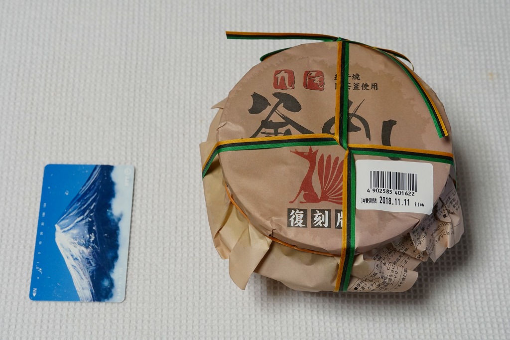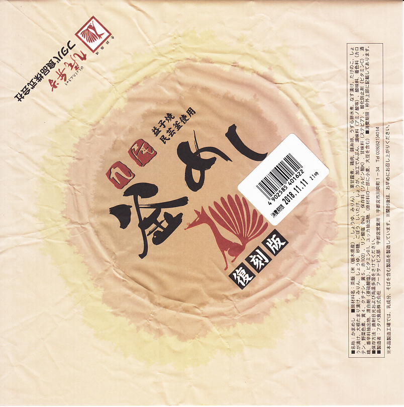 1950(昭和25)年の発売か。本体に駅弁の名前を、ふたに九尾のキツネを浮き彫りにした益子焼の釜飯容器に、やはり駅弁の名前と九尾のキツネを描いた掛紙をかけ、紙ひもでしばる。おしぼりと割りばしは別添。中身は茶飯の上に鶏肉、ごぼう、椎茸、うずらの卵、栗2個、錦糸卵、紅生姜、ラッキョウなどを載せる、内容としては普通の釜飯駅弁。2000年に発売50周年を記念して、発売当時の味と雰囲気を再現したそうで、それで「復刻」の名が付く。