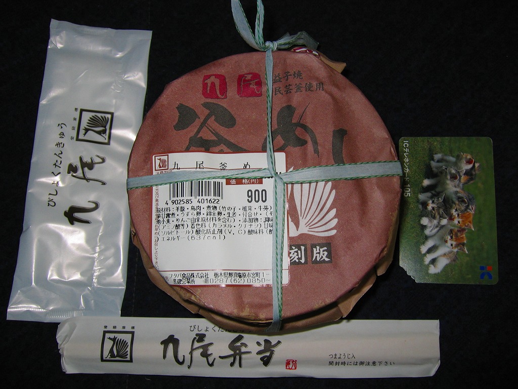 かつての黒磯駅の名物駅弁「九尾釜めし」の復刻版。2005(平成17)年11月限りですべての黒磯駅弁が失われた後、2012(平成24)年の秋に当時の駅弁屋であるフタバ食品が運営する、東北自動車道下り線の上河内サービスエリアで復活した。2016(平成28)年の秋までに土日曜日に限り、JR宇都宮駅の駅ビル「PASEO」の1階にある店舗「縁(えにし)」で買えるようになり、2020(令和2)年の同店の閉店で2階の土産物店「とちびより」へ移動した。