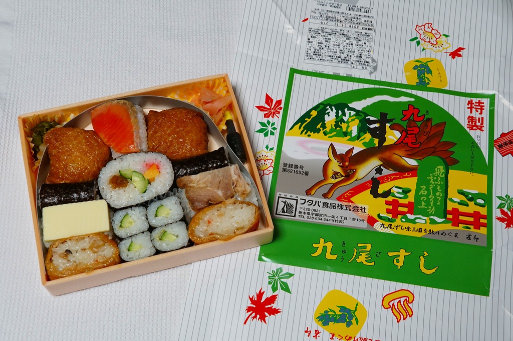 昭和30年代までに黒磯駅で発売された、かつての名物駅弁「九尾すし」の復刻版。2005(平成17)年11月限りですべての黒磯駅弁が失われた後、2012(平成24)年の秋に当時の駅弁屋であるフタバ食品が運営する、東北自動車道下り線の上河内サービスエリアで復活した。2016(平成28)年の秋までに土日曜日に限り、JR宇都宮駅の駅ビル「PASEO」の1階にある店舗「縁(えにし)」で買えるようになり、2020(令和2)年の同店の閉店で2階の土産物店「とちびより」へ移動した。