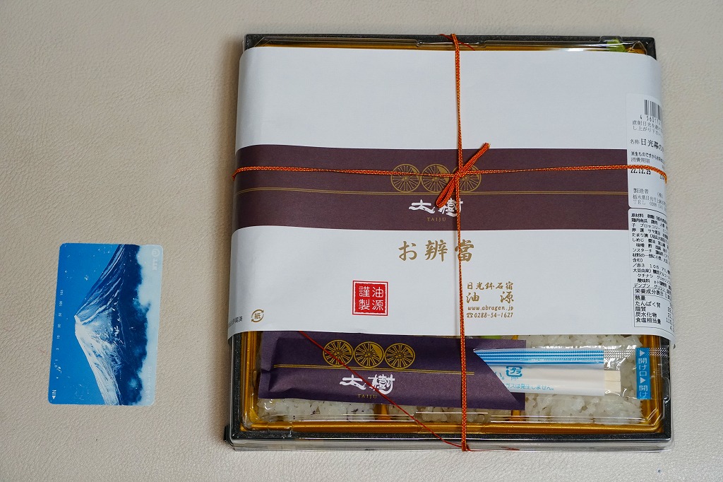 2019(令和元)年の年末までに発売か。東武日光駅の改札外待合室にふたつある売店のうちひとつ「東武日光売店」では、JR宇都宮駅の駅弁も売られる。これはJR宇都宮駅の駅弁屋が「東武日光売店限定販売」とうたう駅弁。箸袋を包む掛紙のような紙に、商品名としてそう明記してある。