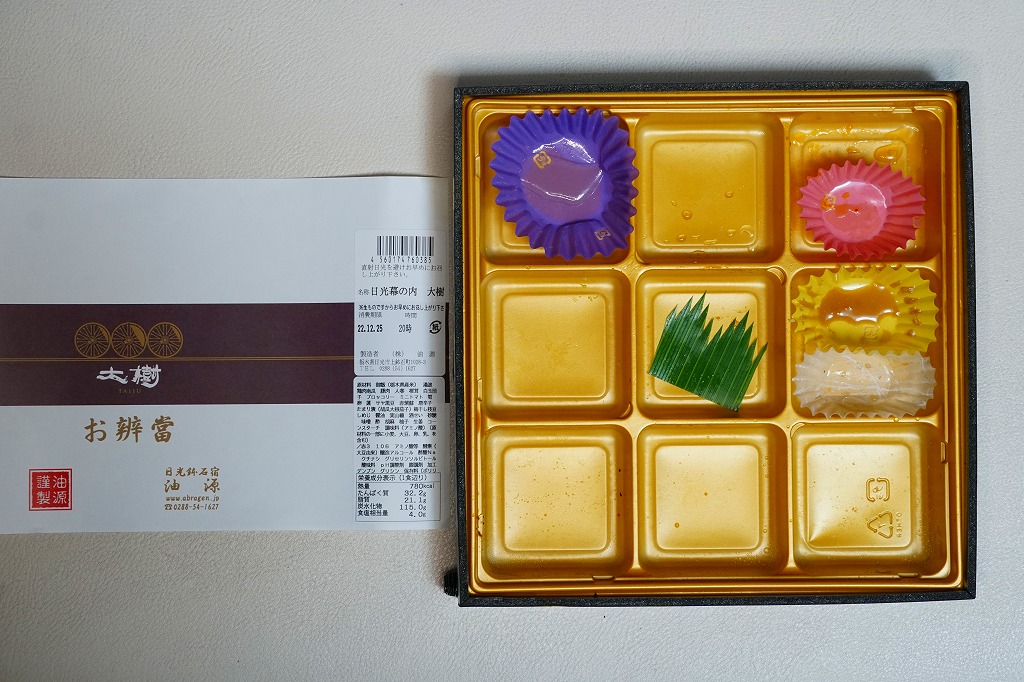 「大樹」とは、下今市駅と鬼怒川温泉駅を結ぶ東武鉄道のSL列車の名前であり、シンプルなデザインの掛紙に列車のロゴマークを使い、駅弁の名前とする。箸袋にも大樹のロゴ。平たいプラ容器の9区画の中身は、日の丸御飯、湯波としめじの御飯、ゆかり御飯、湯波、煮物、肉団子とカボチャと志そまき漬唐辛子、鶏唐揚と野菜、日光HIMITSU豚と「C11207」焼き印入り玉子焼、白玉柚子みそ添えとサヤ黒豆。日光やSLにこだわるも、食べてそんな感じもしない、幕の内タイプあるいはおつまみ豊富なお弁当。