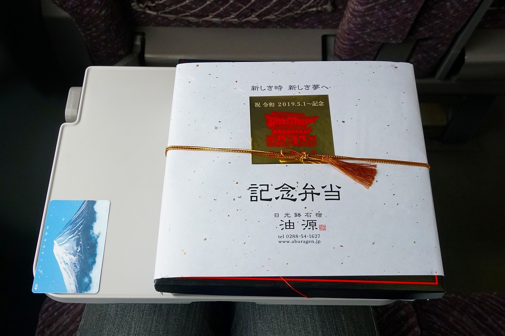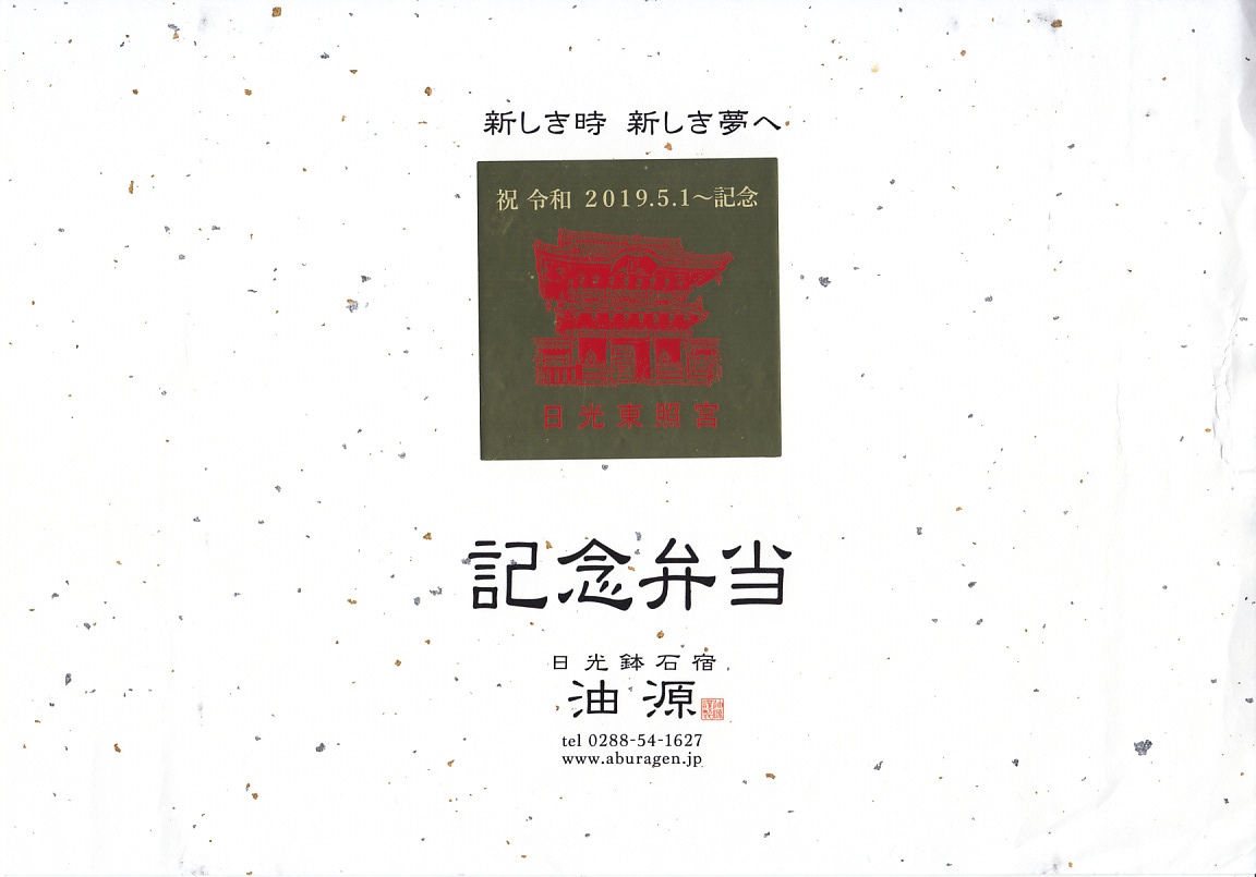 日光東照宮の四百年式年大祭の開催を記念し、「日光東照宮400年式年大祭記念弁当」の名で2015(平成27)年5月31日に東武日光駅、下今市駅、鬼怒川温泉駅にて1,300円で発売。翌年に「日光東照宮記念弁当」へ改称するも、外観や中身は変わらなかった模様。今回はさらに改元を記念して、2019(平成31)年4月27日から、掛紙に「祝令和2019.5.1〜記念」「新しき時 新しき夢へ」と入れ、値段を200円上げた。