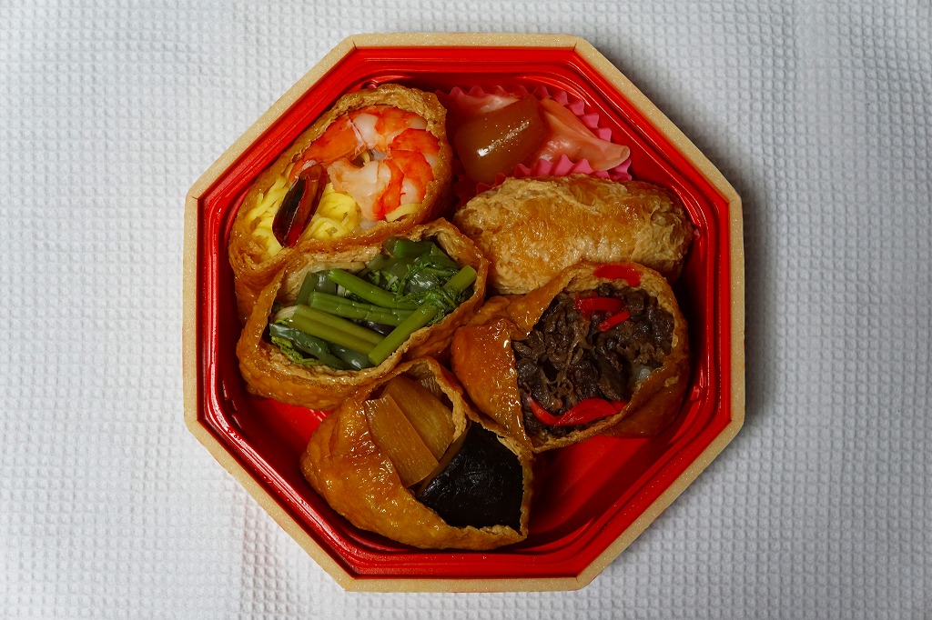 2004(平成16)年頃の発売か。正八角形の容器に、具を見せたおいなりさん4個、見せない稲荷1個、らっきょう、生姜を詰める。いなりの具はすべて異なり、牛しぐれ煮、シイタケとかんぴょう、ワラビとゼンマイ、エビと錦糸卵、何もなしの5種。いろんな味が楽しめて賑やか。価格は2018年の購入時で620円、2020年時点で650円、2023年時点で720円。