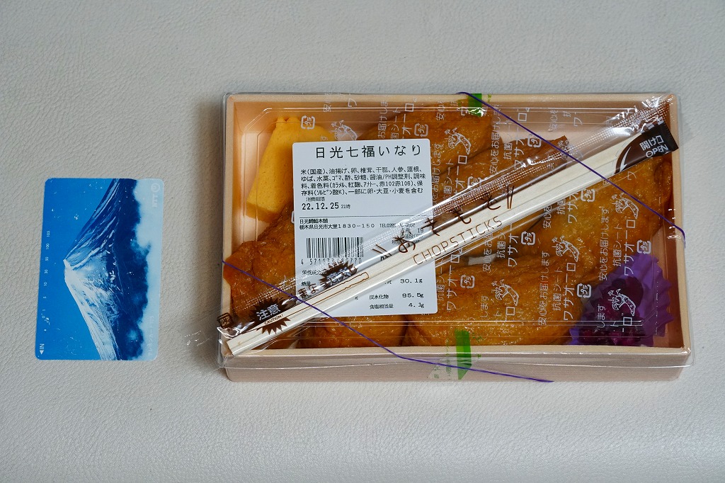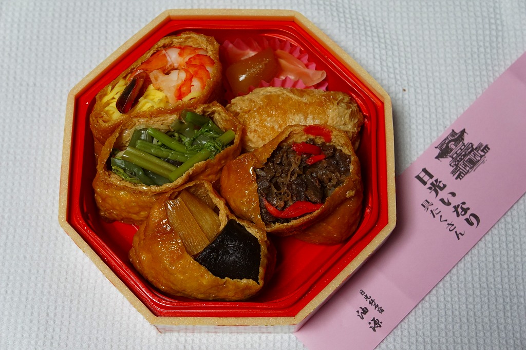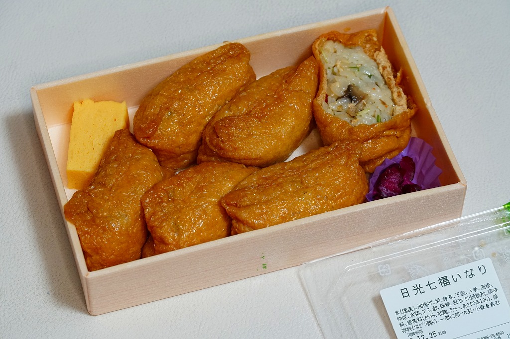 2019(令和元)年の発売か。写真のとおり、おいなりさん6個に極小の玉子焼と柴漬けを添えたお惣菜。見えないところに、稲荷寿司の具として、錦糸卵、しいたけ、かんぴょう、にんじん、れんこん、湯波、水菜が細かく混ざり、これでうまみが出る。日光埋蔵金弁当などの駅弁を持つ調製元の商品で、駅弁売り場で売られる商品なので、掛紙を巻かないことが不思議に思える。価格は2019年の発売時で650円、2022年の購入時で730円、2024年時点で780円、2025年時点で850円。